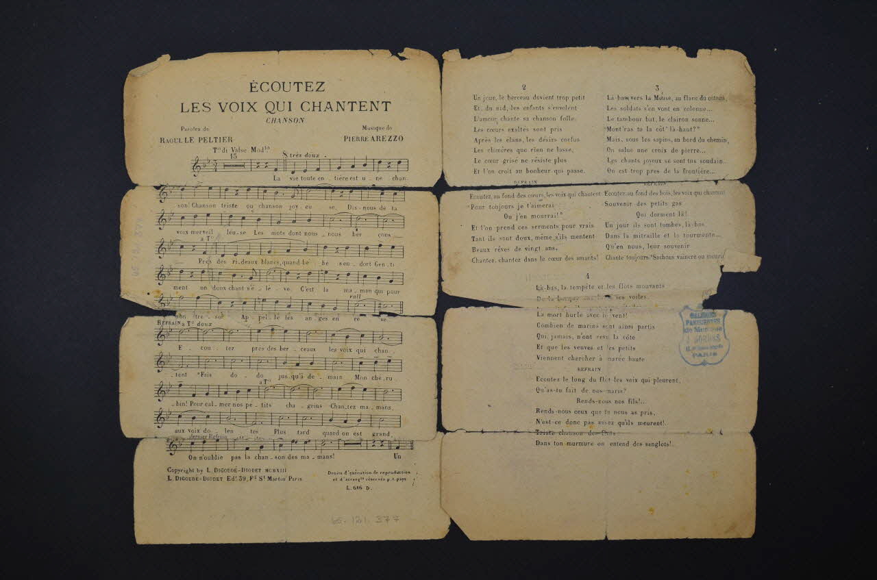 Des inscriptions renseignent le titre, les auteurs, les exécutants et l'éditeur. A l'intérieur, paroles et partitions Au dos, liste des nouveautés de 1916.Matériaux et techniques