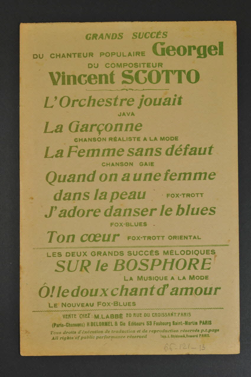 Les inscriptions renseignent le titre de la chanson, le nom des auteurs, de l'artiste et de l'éditeur. A l'intérieur, partitions et paroles de la chanson. Au dos, liste d?autres partitions publiées par l?éditeur.Décor