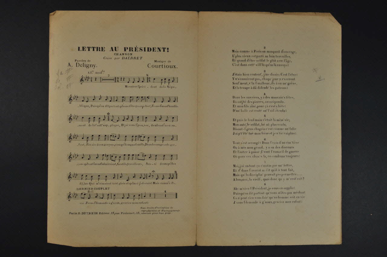 Les inscriptions renseignent le titre de la chanson, le nom des auteurs, de l'artiste et de l'éditeur. A l'intérieur, partitions et paroles de la chanson. Au dos, liste d?autres partitions publiées par l?éditeur.Décor