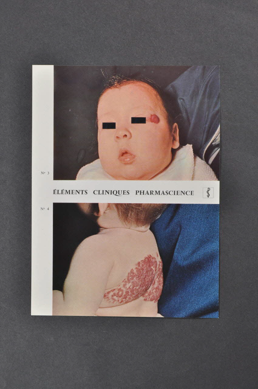 Le recto est composé de deux photographies couleur numérotées : en haut, la tête d'un bébé avec une grosseur rouge au coin de l'oeil gauche. Des rectangles foncés ont été imprimés sur ses yeux. L'image en bas figure le dos d'un bébé présentant une éruption rouge étendue. Le verso est constitué d'un texte de présentation d'un médicament en noir avec des titres ocres.Inscriptions