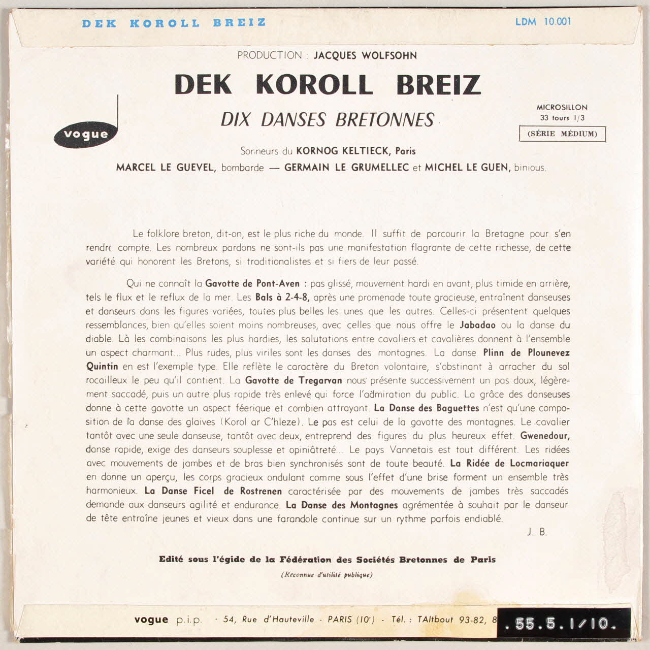 disque 33 tours, Danse des baguettes, Gavotte de Pont-Aven, Gwenedour, Danse ficel de Rostrenen, Dek koroll breiz, Ridée de Locmariaquer, Plinn de Plounevez Quintin, Gavotte des montagnes, Gavotte de Tregarvan