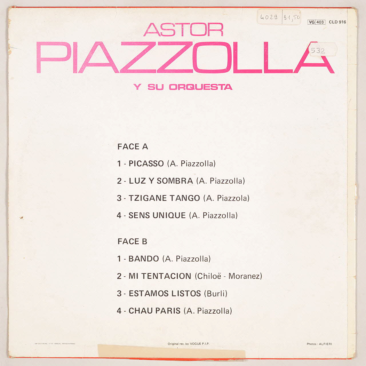 Le verso présente un fond blanc. En partie haute se trouve le nom de Astor Piazzola en majuscule et en rouge. En dessous se trouvent les huit titres de l'album, en noir sur blanc. L'étiquette du vinyle présente un cercle irrégulier orange sur son pourtour, dans lequel s'inscrit le nom de la maison de disque [Vogue] en orange vert et bleu, avec la signature de Sonia Delawnay.Inscriptions