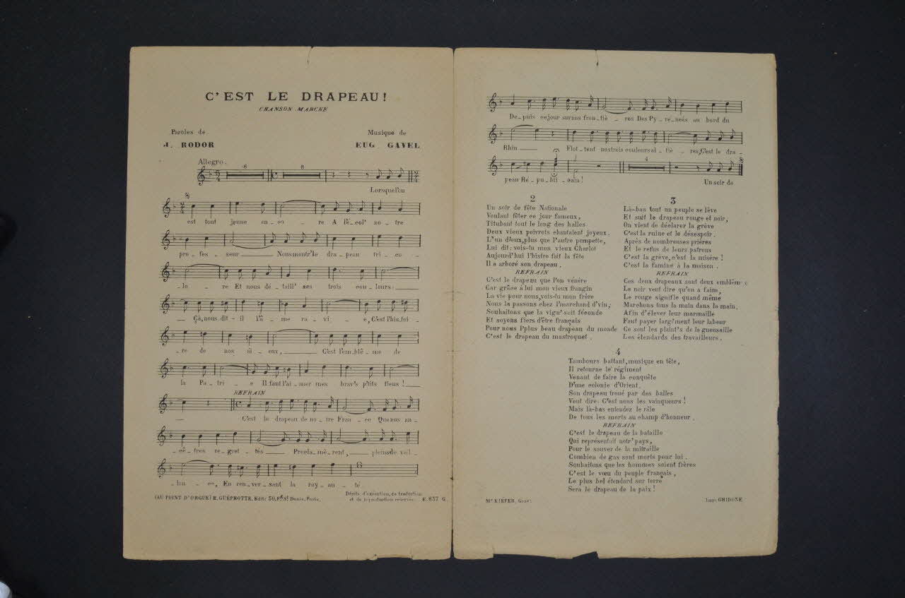 Les inscriptions renseignent le titre de la chanson, le nom des auteurs, de l'artiste et de l'éditeur. A l'intérieur, partitions et paroles de la chanson. Au dos, liste d?autres partitions publiées par l?éditeur.Décor