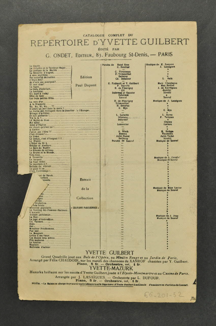 Des inscriptions renseignent le titre, les auteurs, les exécutants et l'éditeur. A l'intérieur, partition et paroles de la chanson. Au dos, liste d'autres partitions publiées par l'éditeur.Décor
