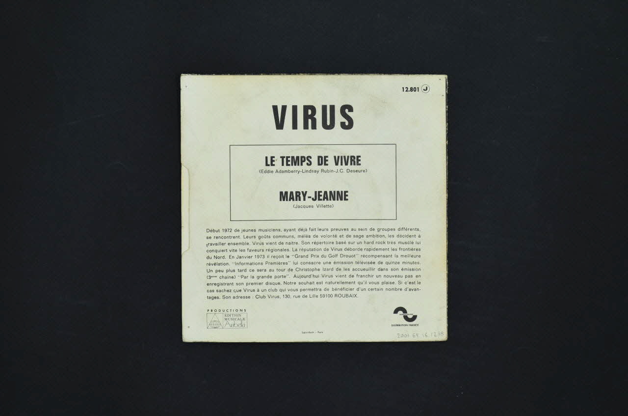 Sur le recto, au fond noir, se trouvent nom du groupe en lettres jaunes contournés de rose puis deux morceaux en jaune et rose. Le dernier morceau est placé dans une forme de guitare qui sourit. La partie inférieure est occupé par des figures humaines à tête de virus. Le nom de l'éditeur est visible dans le coin supérieur gauche. Le verso est imprimé en noir sur fond blanc. De haut en bas, sont disposés le nom du groupe, les titres des chansons dans un cadre, un texte de présentation et deux logos. La partie gauche du verso est légèrement encochée.Matériaux et techniques