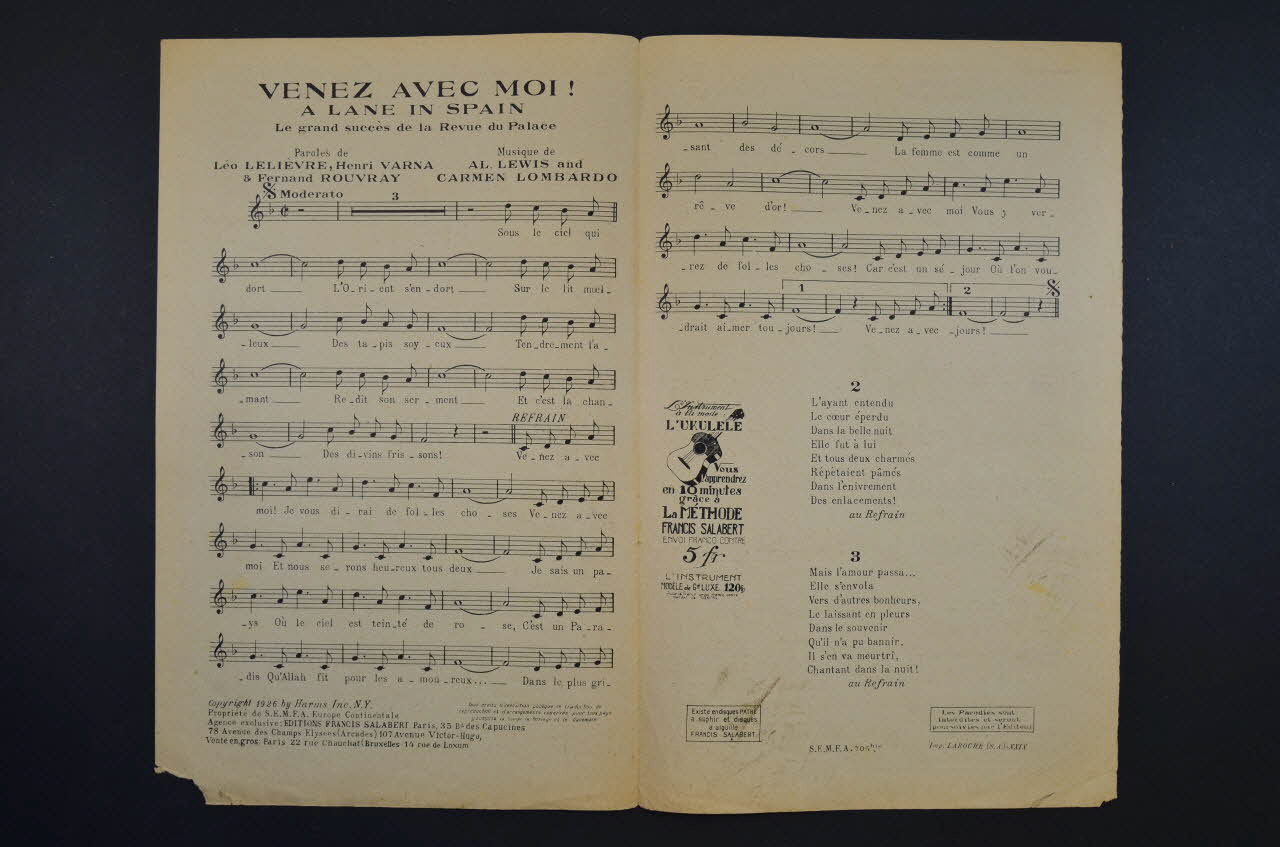 A l'intérieur, partition et paroles de la chanson. Au dos, liste d'autres partitions publiées par l'éditeur.Décor