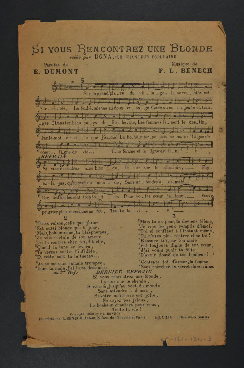 Des inscriptions renseignent les titres, les auteurs, les exécutants et l'éditeur. A l'intérieur et au dos, partitions et paroles des chansons.Matériaux et techniques
