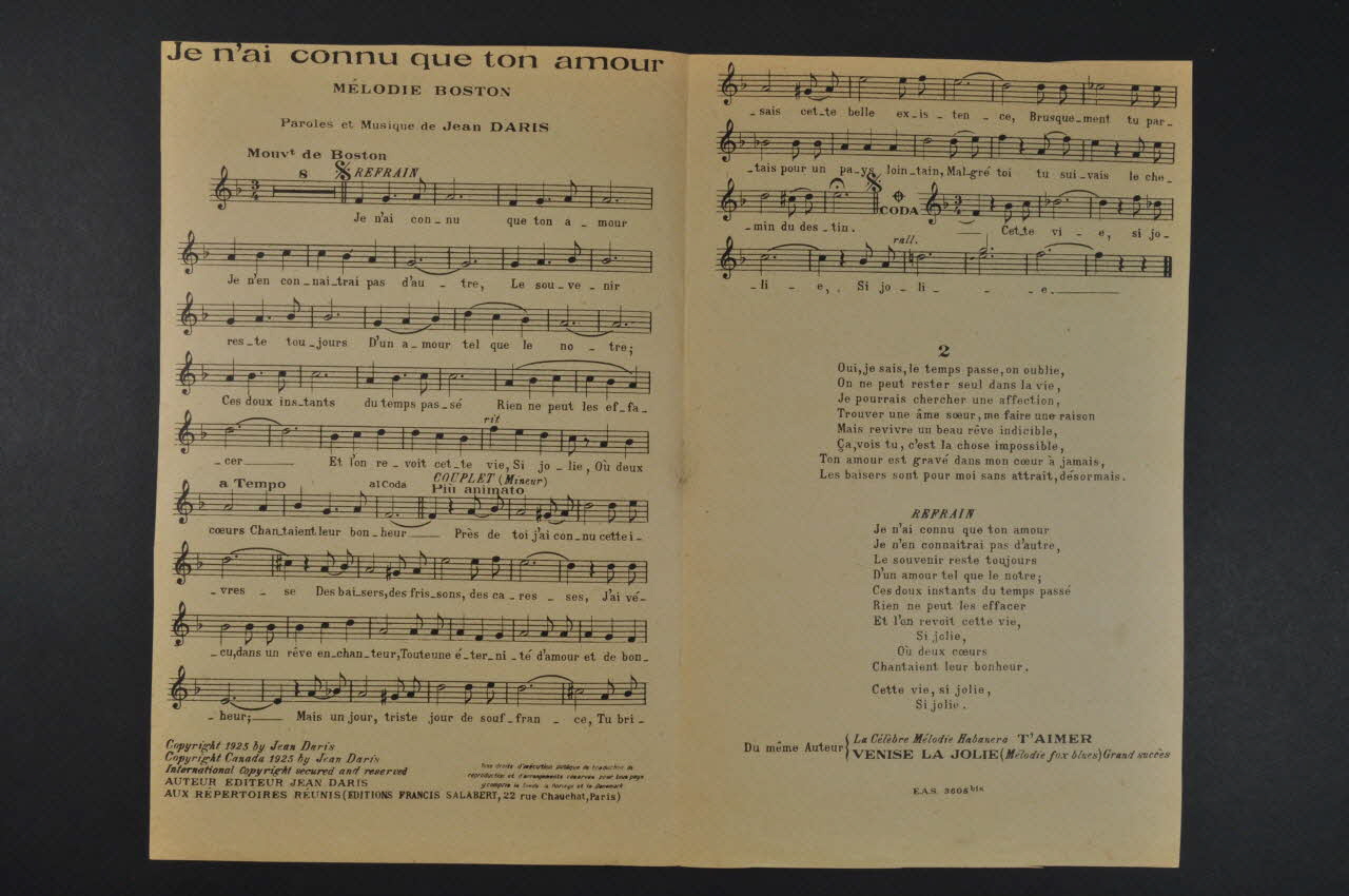 Les inscriptions renseignent le titre de la chanson, le nom des auteurs, de l'artiste et de l'éditeur. A l'intérieur, partitions et paroles de la chanson. Au dos, liste d?autres partitions publiées par l?éditeur.Décor