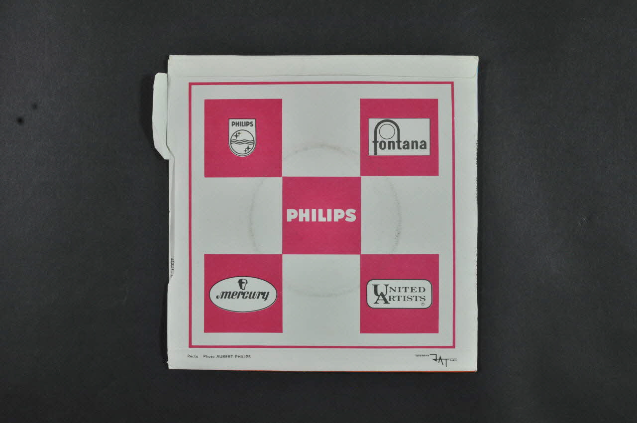 Le recto comporte un portrait noir et blanc du chanteur sur la droite. Le nom de l'artiste, le titre des chansons sont inscrits en lettres "fantaisie" sur un fond violet et orange. Le logo de l'éditeur est dans l'angle supérieur gauche. Il y a des inscriptions manuscrites sur le recto. Le verso contient un damier rose et blanc avec des logos dans les carrés roses. Un onglet blanc avec des inscriptions noires est situé le long de la bordure gauche. Le disque rond et noir comporte une perforation circulaire au centre. Le centre bleu contient le nom du chanteur, le titre des chansons, le logo de l'éditeur ainsi que d'autres inscriptions en bleu.Matériaux et techniques