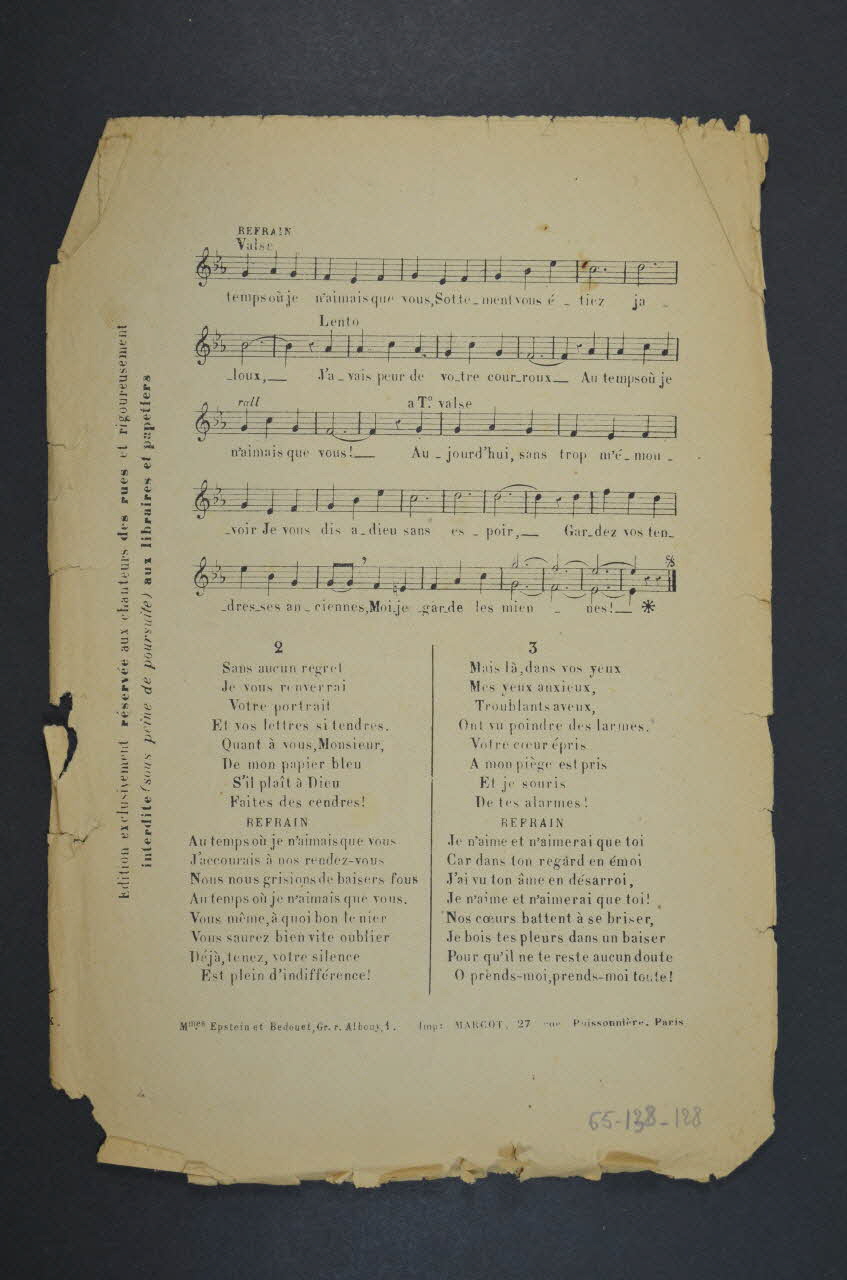 Feuillet rectangulaire en papier industriel imprimé. Le feuillet contient la partition et les paroles de la chanson. Au dos, publicité pour l'éditeur.Matériaux et techniques
