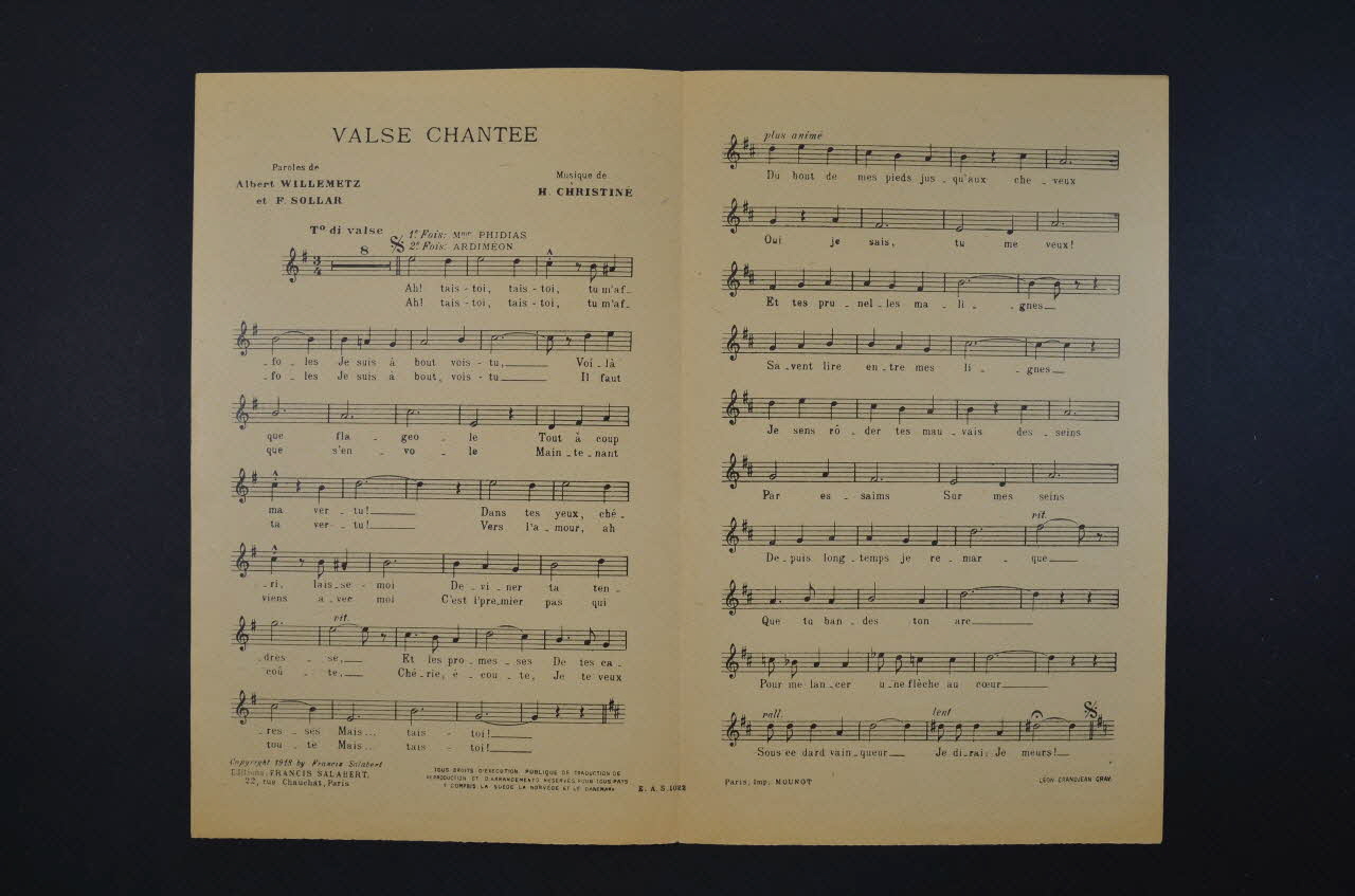 Des inscriptions renseignent le titre, les auteurs, les exécutants et l'éditeur. A l'intérieur, partition et paroles de la chanson. Au dos, liste d'autres partitions publiées par l'éditeur.Décor