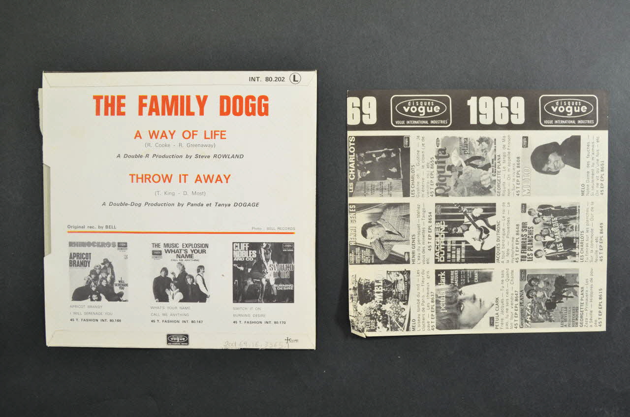 Le verso, de fond blanc, comporte des inscriptions rouges et noire dans le haut, accompagnées de photographies de trois pochettes de disques en miniature dans le bas.