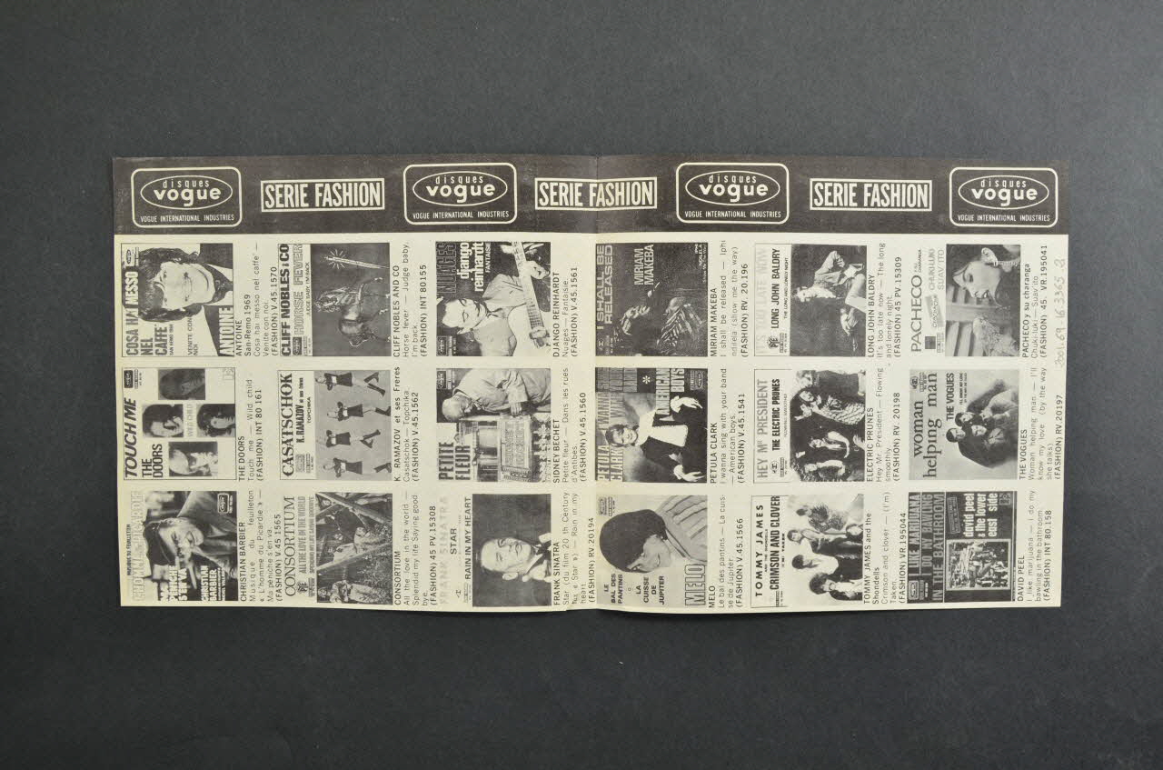.2: Cette feuille pliée en deux comporte sur ses deux faces des photographies en noir et blanc de pochettes de disques accompagnées d'inscriptions en petits caractères noirs.
