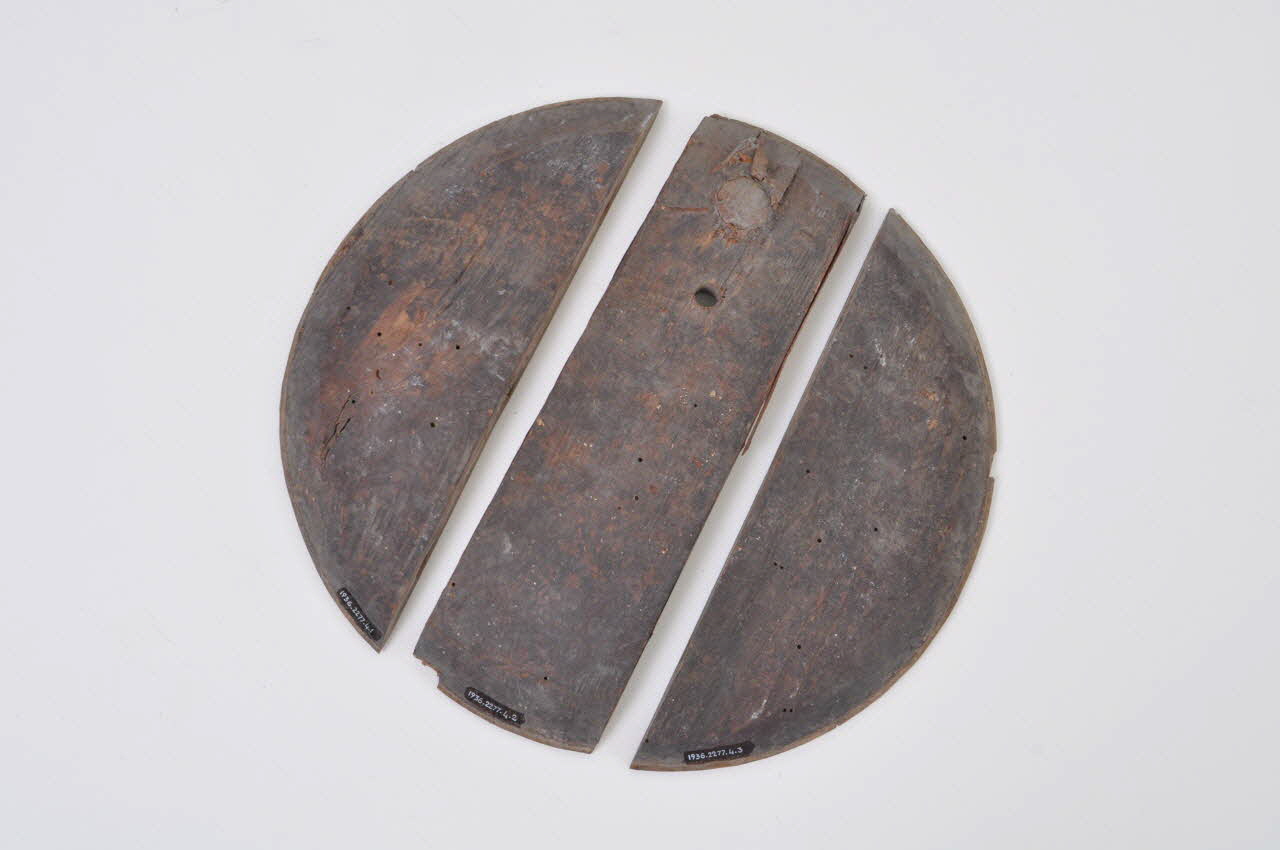 Couvercle constitué de trois planches en bois taillé et biseauté sur une face. Une des planches (.2) présente une ouverture circulaire dans laquelle est fixé un bouchon en liège. Cette même planche (.2) a un petit évidement circulaire voisinant le bouchon.Matériaux et techniques