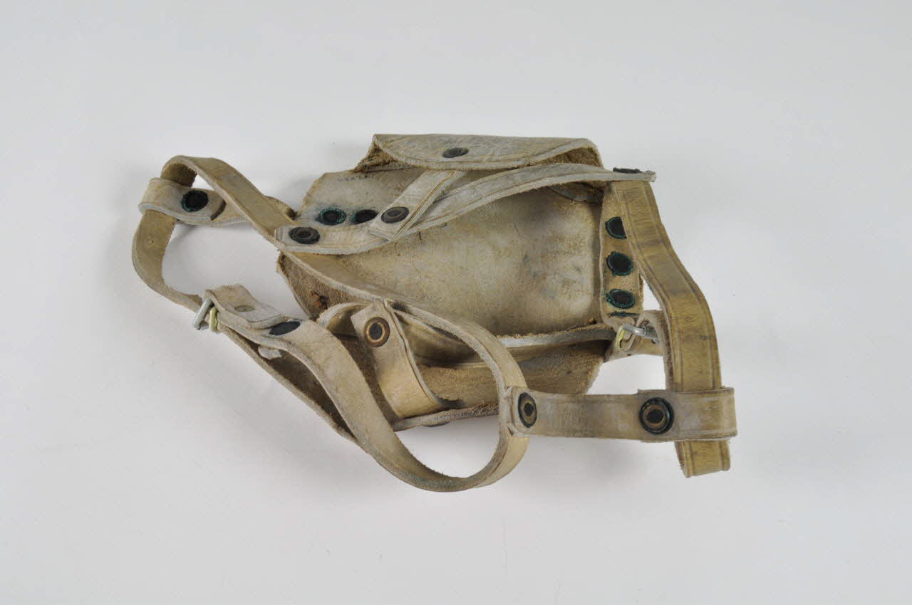 Masque en cuir beige, formé d'une plaque ovale, où sont fixées des courroies par des rivets de cuivre et des boucles métalliques.Matériaux et techniques