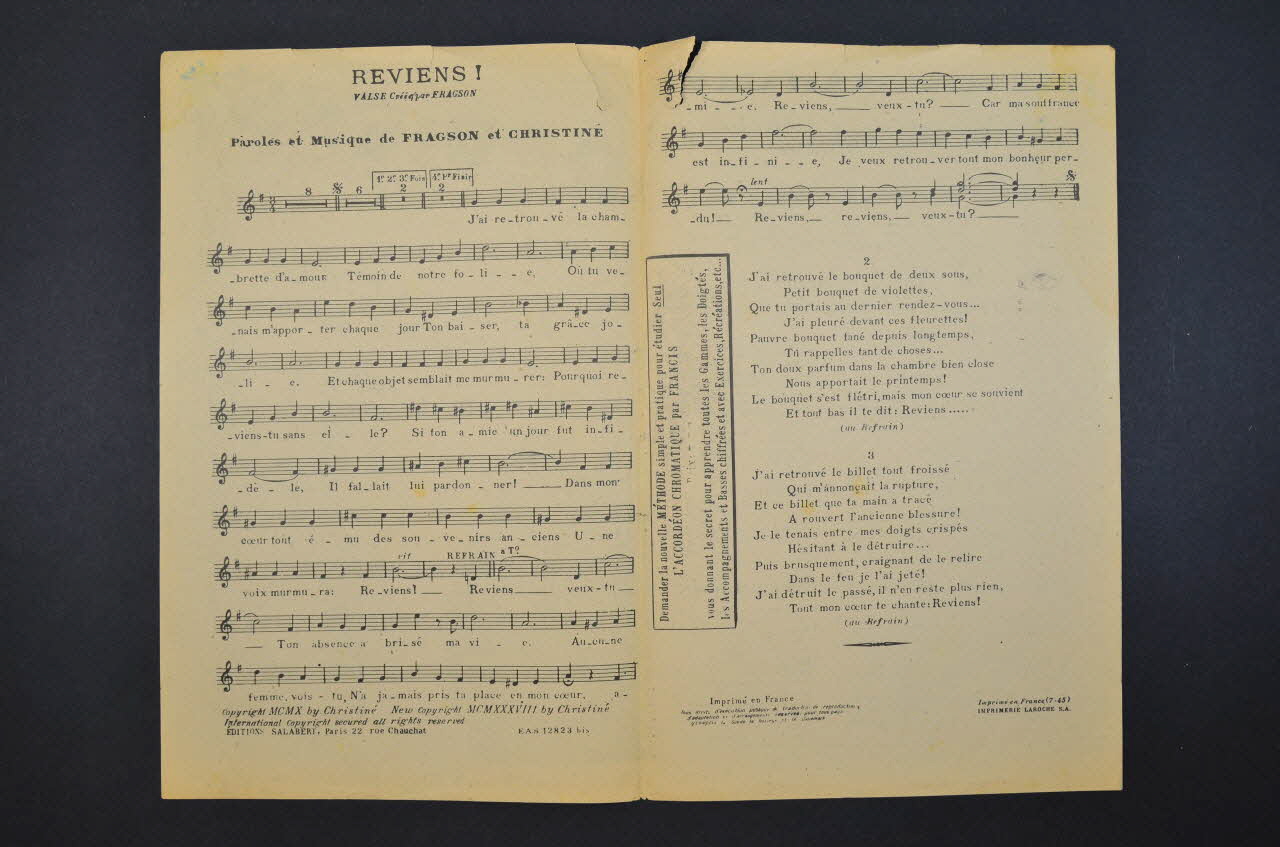 chanson, petit format, partition de musique, Reviens