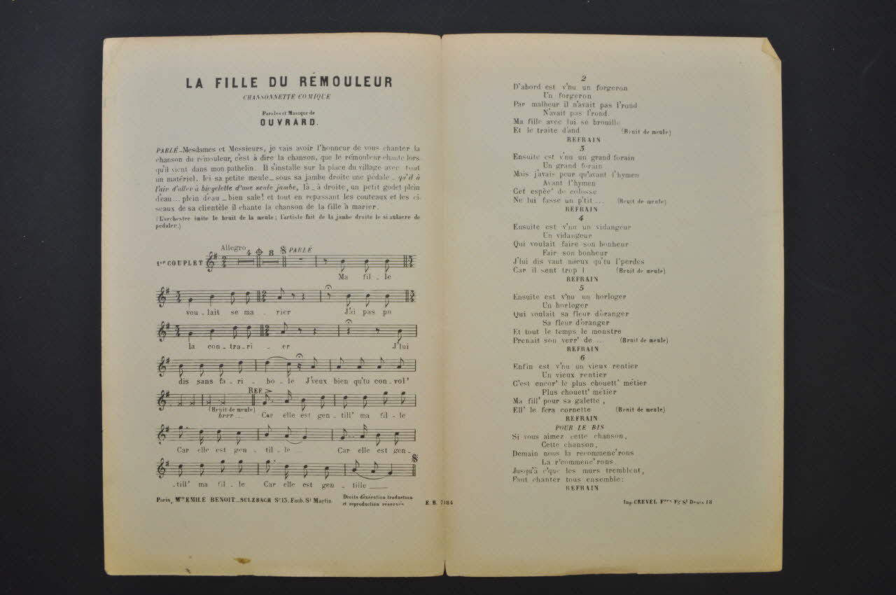 Feuillet rectangulaire en papier industriel imprimé à l'encre noire. L'intérieur présente les paroles et la partition de la chanson. Au dos, publicité pour l'éditeur.Matériaux et techniques