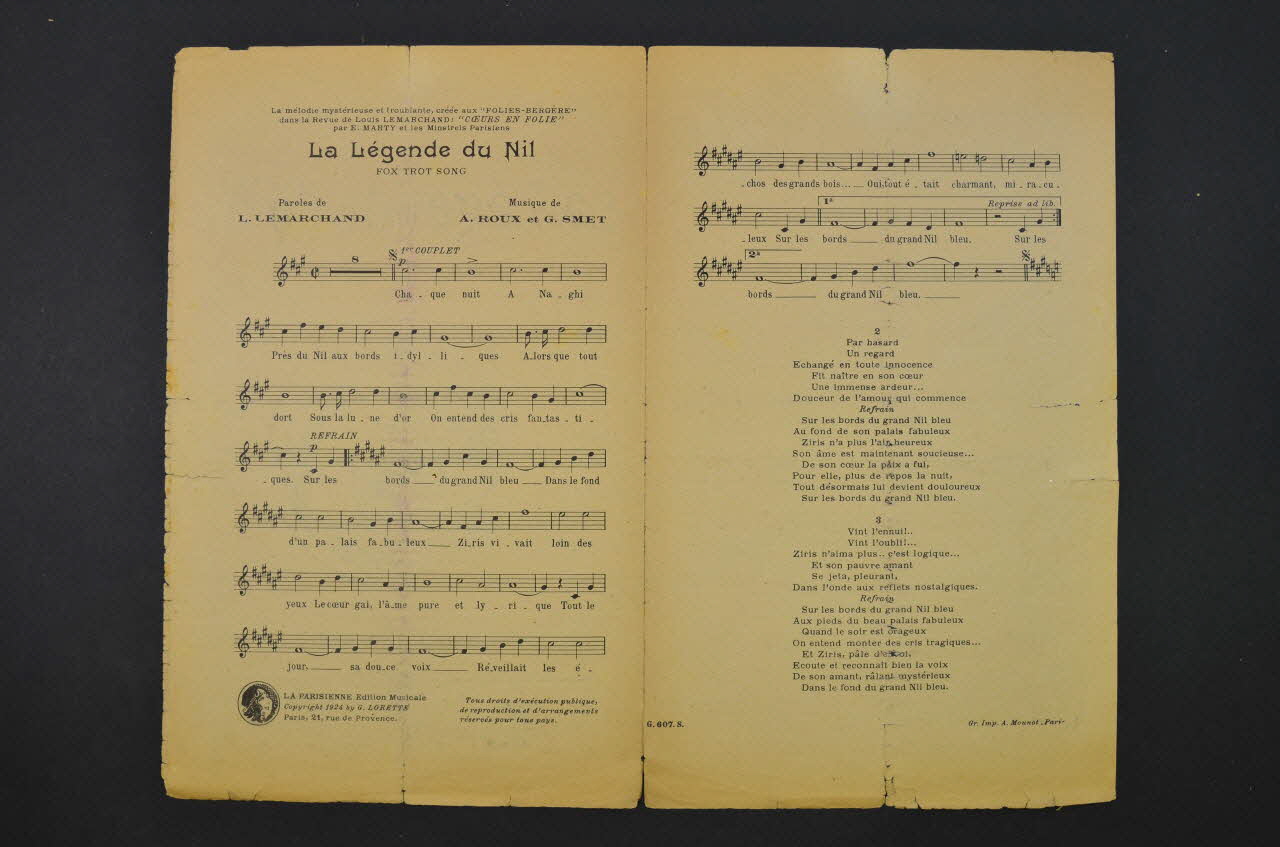 Les inscriptions renseignent le titre de la chanson, le nom des auteurs, de l'artiste et de l'éditeur. A l'intérieur, partitions et paroles de la chanson. Au dos, liste d?autres partitions publiées par l?éditeur.Décor