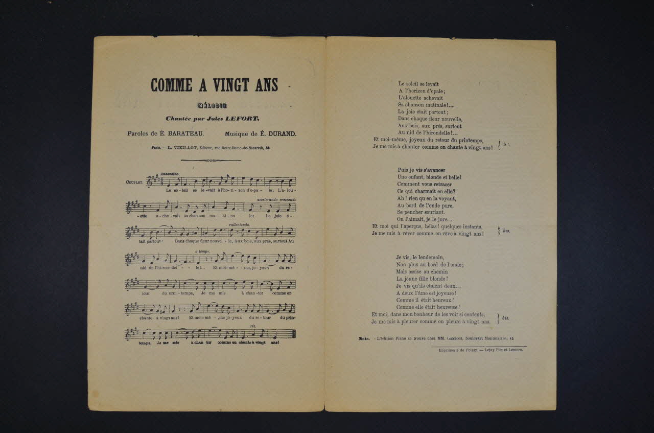 Sur la couverture, le portrait photographique de Maréchal, en buste. Les inscriptions renseignent le titre de la chanson, le nom des auteurs, de l'artiste et de l'éditeur. A l'intérieur, partition et paroles de la chanson. Au dos, liste d'autres partitions publiées par l'éditeur.Décor