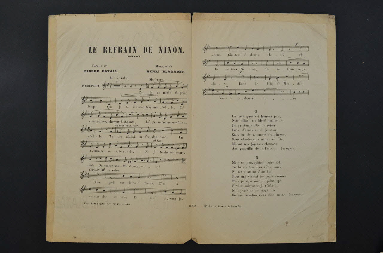Les inscriptions renseignent le titre de la chanson, le nom des auteurs, de l'artiste et de l'éditeur. A l'intérieur, la partition et les paroles. Au dos, une liste de titres disponibles chez le même éditeur.Décor
