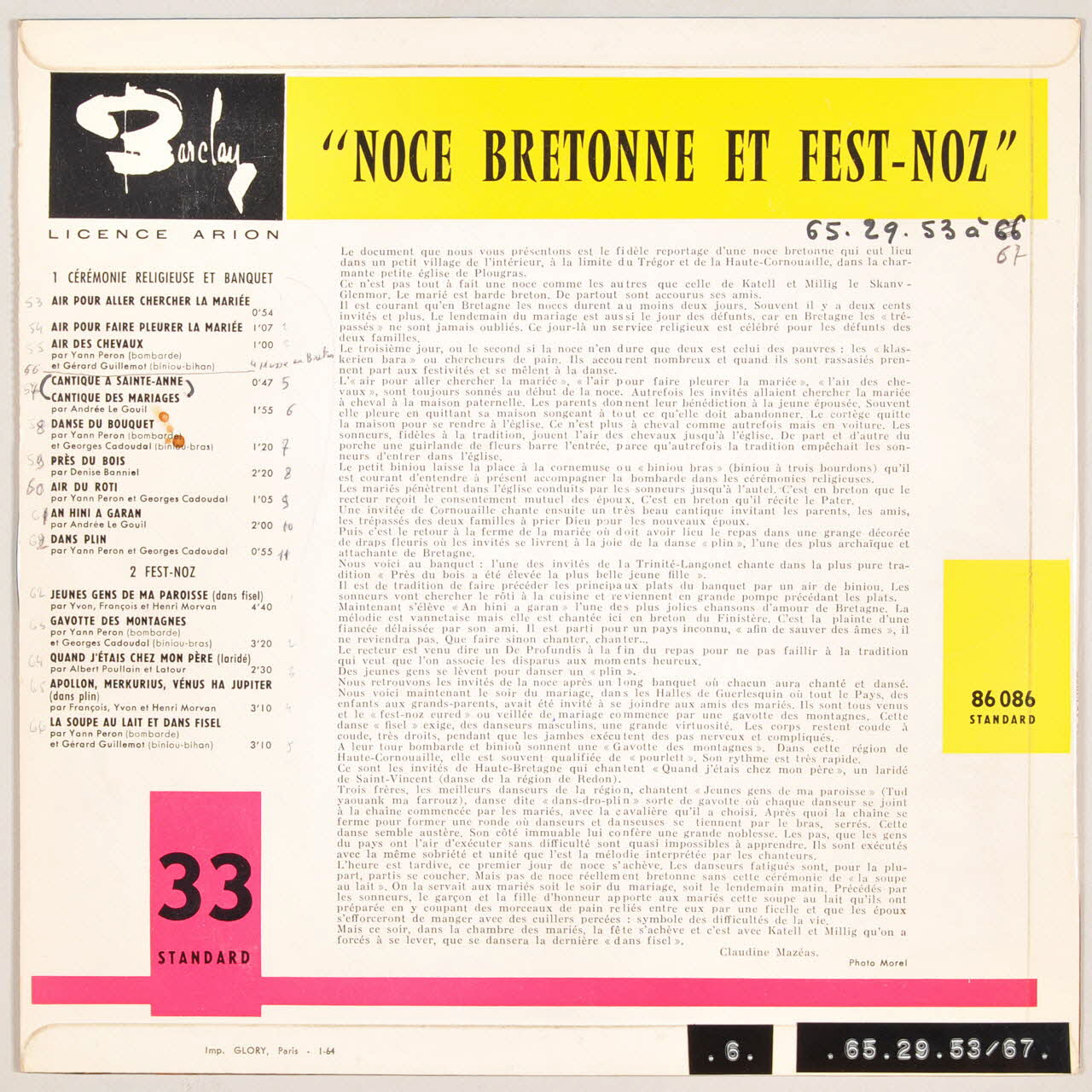 Lieu : Côtes-d'Armor, Bretagne, FranceDate : 1965Collecteur : Claudine MazéasAcquisition