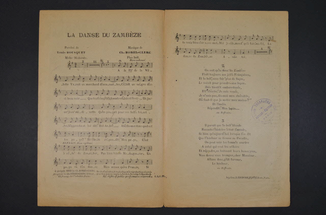Des inscriptions renseignent le titre, les auteurs, les exécutants et l'éditeur. A l'intérieur, partition et paroles de la chanson. Au dos, liste d'autres partitions publiées par l'éditeur.Matériaux et techniques
