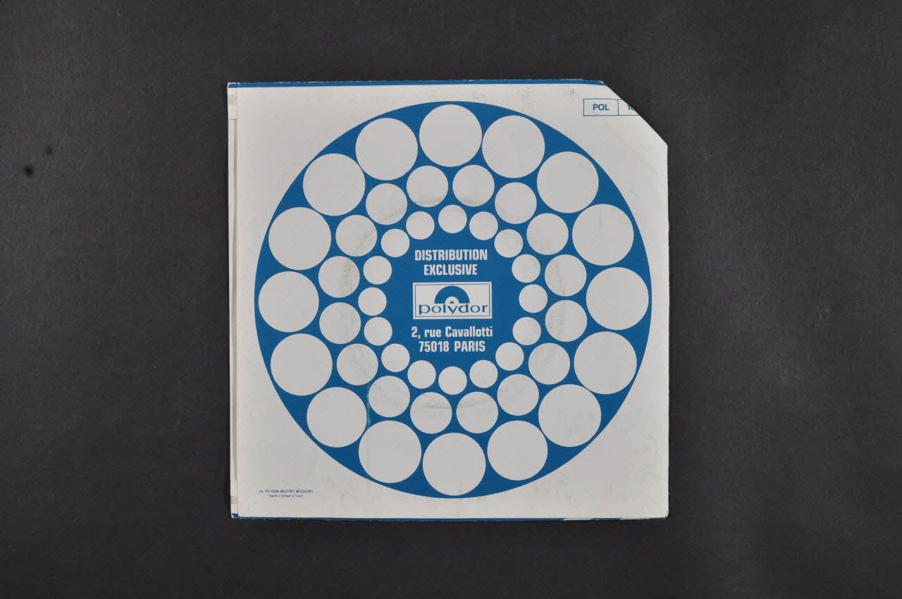 Le recto comporte un fond bleu avec le nom de l'artiste, le titre des chansons en diagonale encadrés de lignes bleues claires. Le logo de l'éditeur est dans l'angle inférieur droit. L'angle supérieur gauche est découpé. Le verso contient un cercle bleu avec de multiples cercles blanc à l'intérieur qui encadrent le logo de l'éditeur. Le disque rond et noir comporte une perforation circulaire au centre. Le centre orange contient le nom du chanteur, le titre des chansons, le logo de l'éditeur ainsi que d'autres inscriptions en noir.Matériaux et techniques