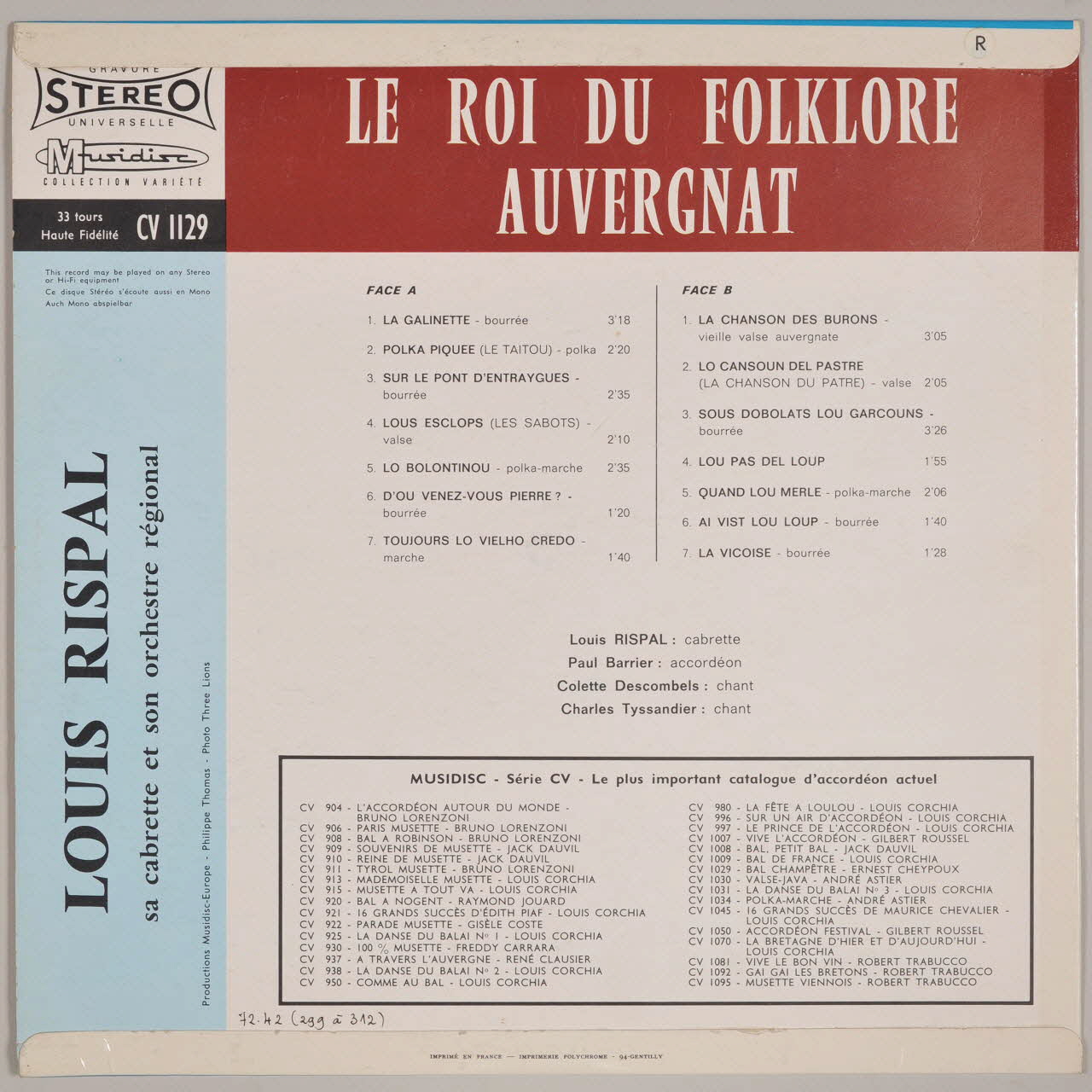 La pochette du disque présente, au recto, une photographie couleur montrant Monsieur Louis Rispal jouant de la cabrette devant un bâtiment en pierres surmonté d'un toit pointu.