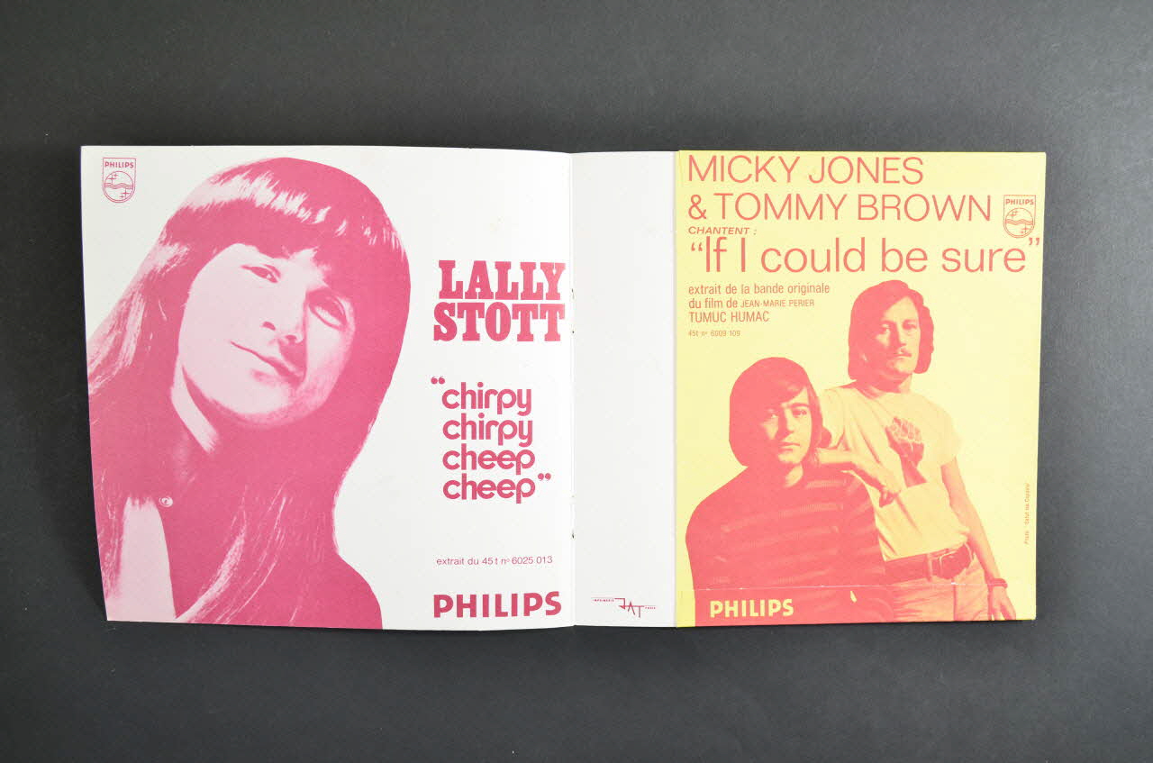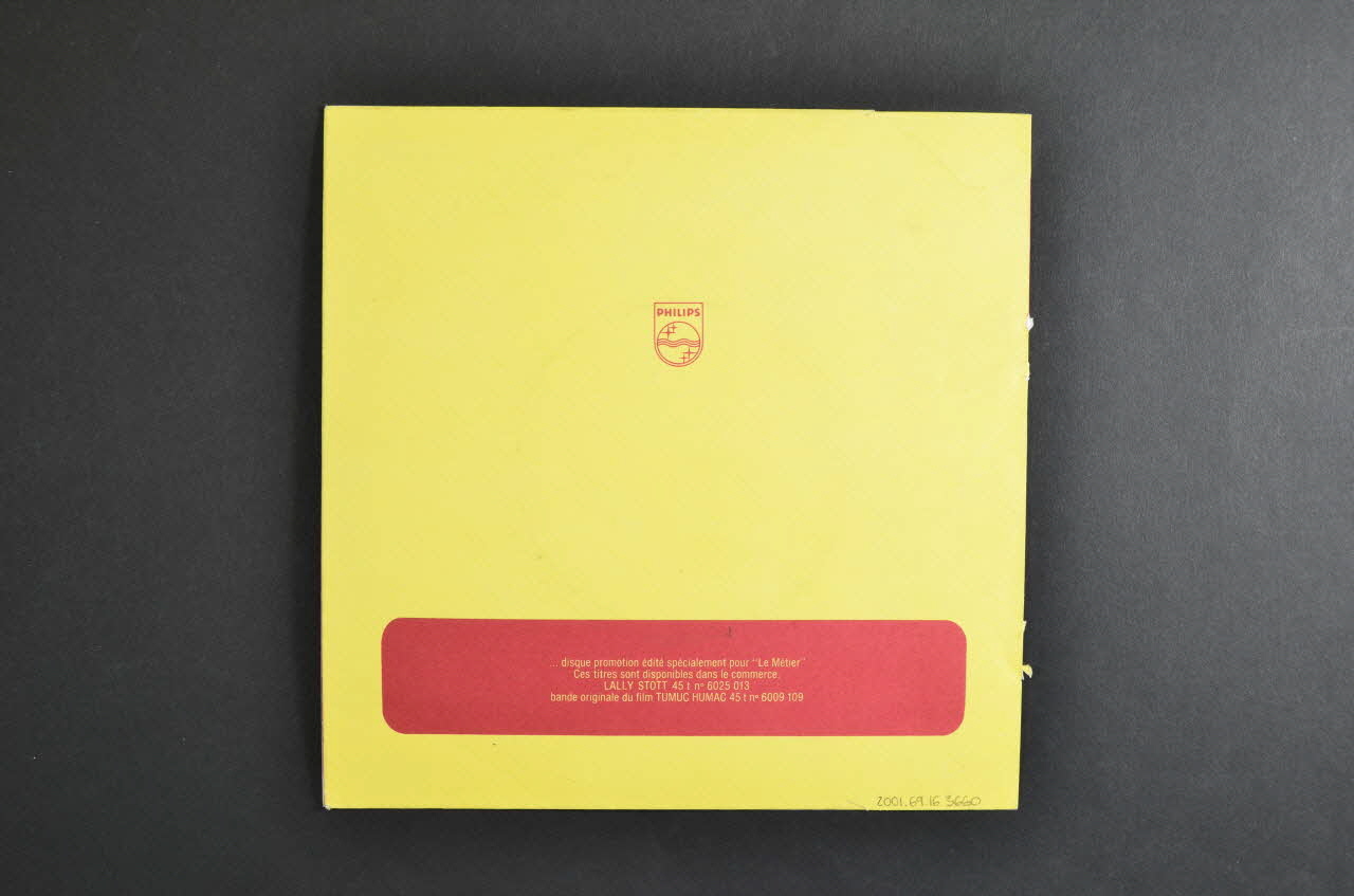 Le recto comporte une photographie colorée en rouge du chanteur sur fond jaune. Le nom de l'artiste et les titres des chansons sont inscrits de chaque côté de l'image. Le logo de l'éditeur est dans l'angle inférieur gauche. Le verso contient le logo de l'éditeur et un encart rouge sur fond jaune. A l'intérieur, le volet un se compose de la photographie colorée en rouge du chanteur avec son nom et les titres des chansons sur fond blanc. Le volet deux est double pour y glisser le vinyle. Il se compose de la photographie colorée en rouge de deux chanteurs avec leurs noms et le titre de la chanson en rouge sur fond jaune.Matériaux et techniques