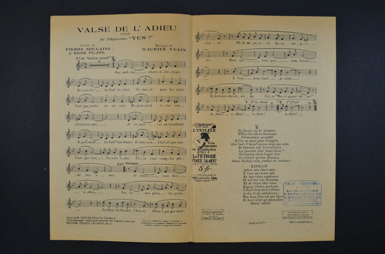 Les inscriptions renseignent le titre de la chanson, le nom des auteurs, de l'artiste et de l'éditeur. A l'intérieur, partitions et paroles de la chanson. Au dos, liste d?autres partitions publiées par l?éditeur.Décor