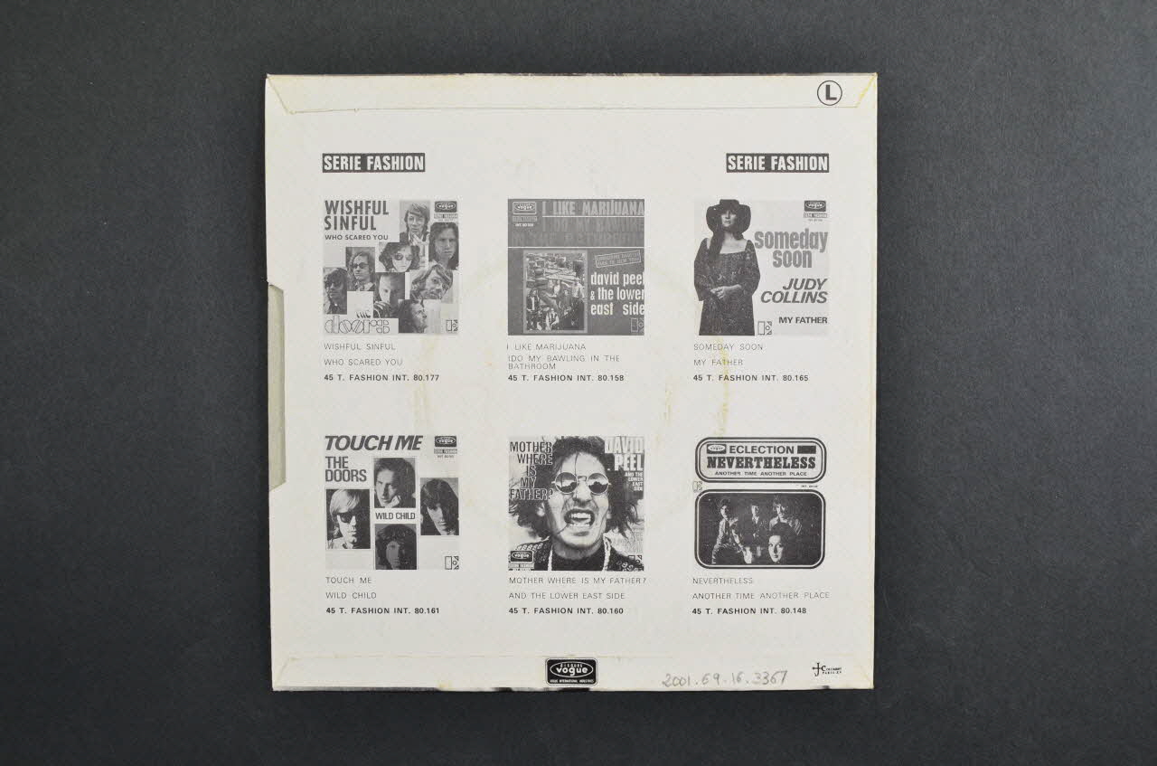 Le verso, de fond blanc, comporte des photographies de pochettes de disques en miniature accompagnées d'inscriptions noires.