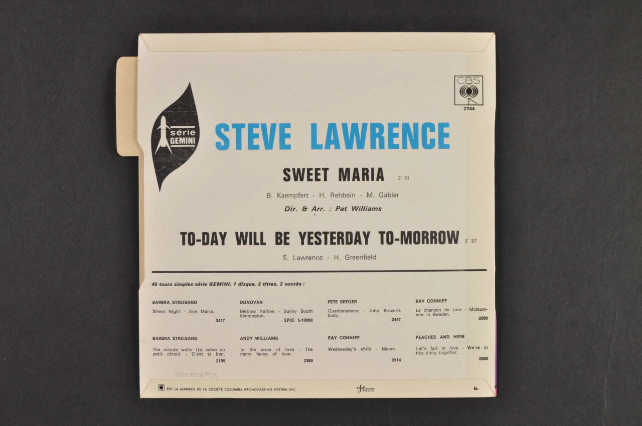 Le recto, plastifié, présente un fond blanc. Le nom du chanteur, les titres des deux chansons, deux logos et le dessin représentant une jeune femme sont en turquoise, violet et rose. Une étiquette en carton blanc est relié au recto par des pointillés, elle porte des inscriptions noires. Au verso figurent des inscriptions bleues et noires et deux logos noirs sur un fond blanc.Matériaux et techniques
