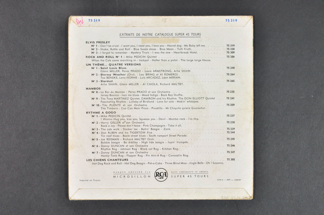 Le recto est illustré d'une photographie noir et blanc avec des inscriptions en rose et bleu et le logo dans le coin supérieur droit. Le dos sur fond blanc porte des titres de chansons et de leurs interprètes en caractères noirs avec le logo en bas.Matériaux et techniques
