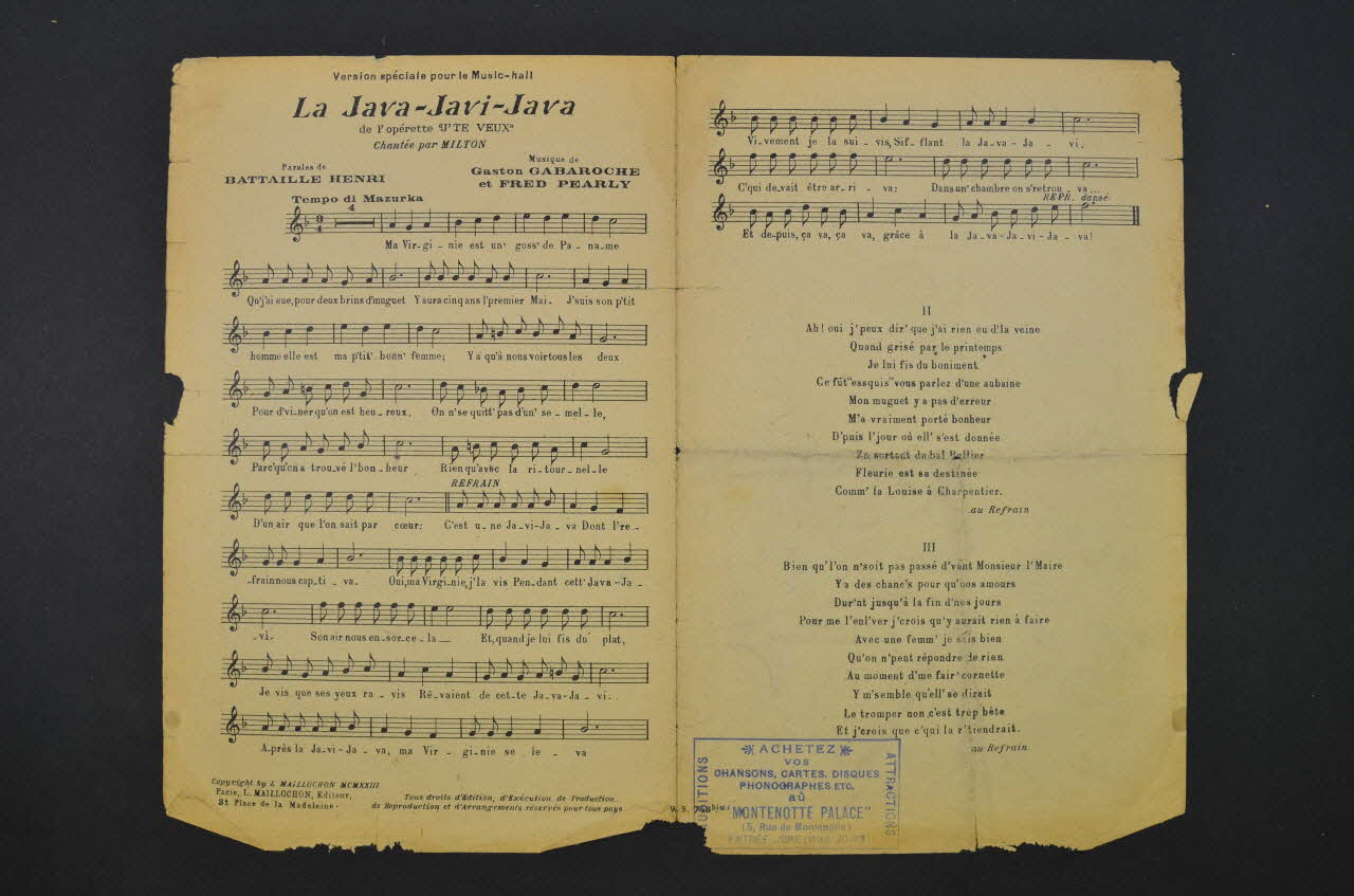 Les inscriptions renseignent le titre de la chanson, le nom des auteurs, de l'artiste et de l'éditeur. A l'intérieur, la partition et les paroles. Le dos est laissé vierge.Décor