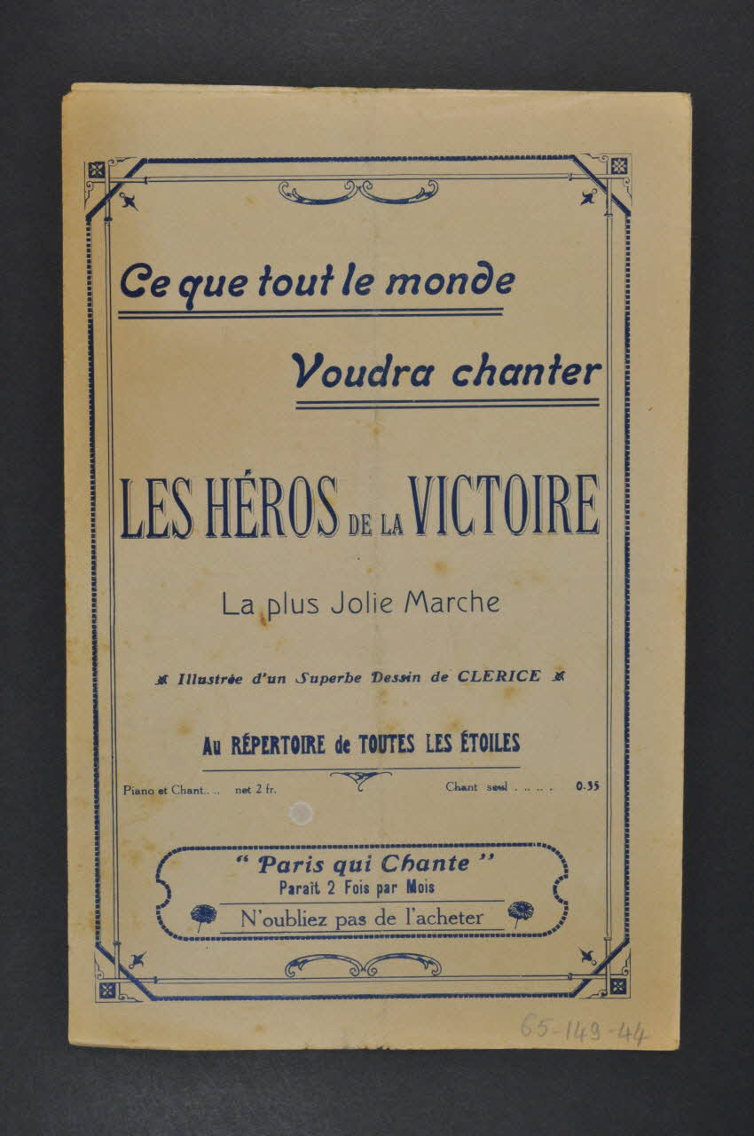 Des inscriptions renseignent le titre, les auteurs, les exécutants et l'éditeur. A l'intérieur, partition et paroles de la chanson. Au dos, liste d'autres partitions publiées par l'éditeur.Décor