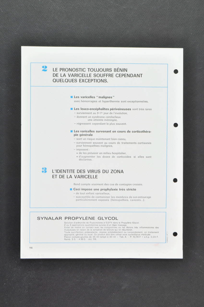 Feuille de papier glacée de format A4, perforée de quatre trous circulaires sur le côté gauche. L'avant de la fiche présente : en haut, à gauche, en noir, le numéro et le titre du chapitre ; sur la face avant, trois fins cadres bleu : un premier, étroit, avec le titre inscrit en bleu ; un second, plus large, accolé, avec une photographie en couleur représentant, en gros plan, le visage d'un enfant atteint de varicelle et dont les yeux sont cachés par une bande noire ; un troisième cadre, étroit, séparé, portant un encart publicitaire pour le médicament "synalar propylène glycol". L'arrière de la fiche reprend la même maquette avec une titre de paragraphe dans le cadre supérieur et sans photographie. Cette fiche porte les numéros de page 49 et 50.Inscriptions