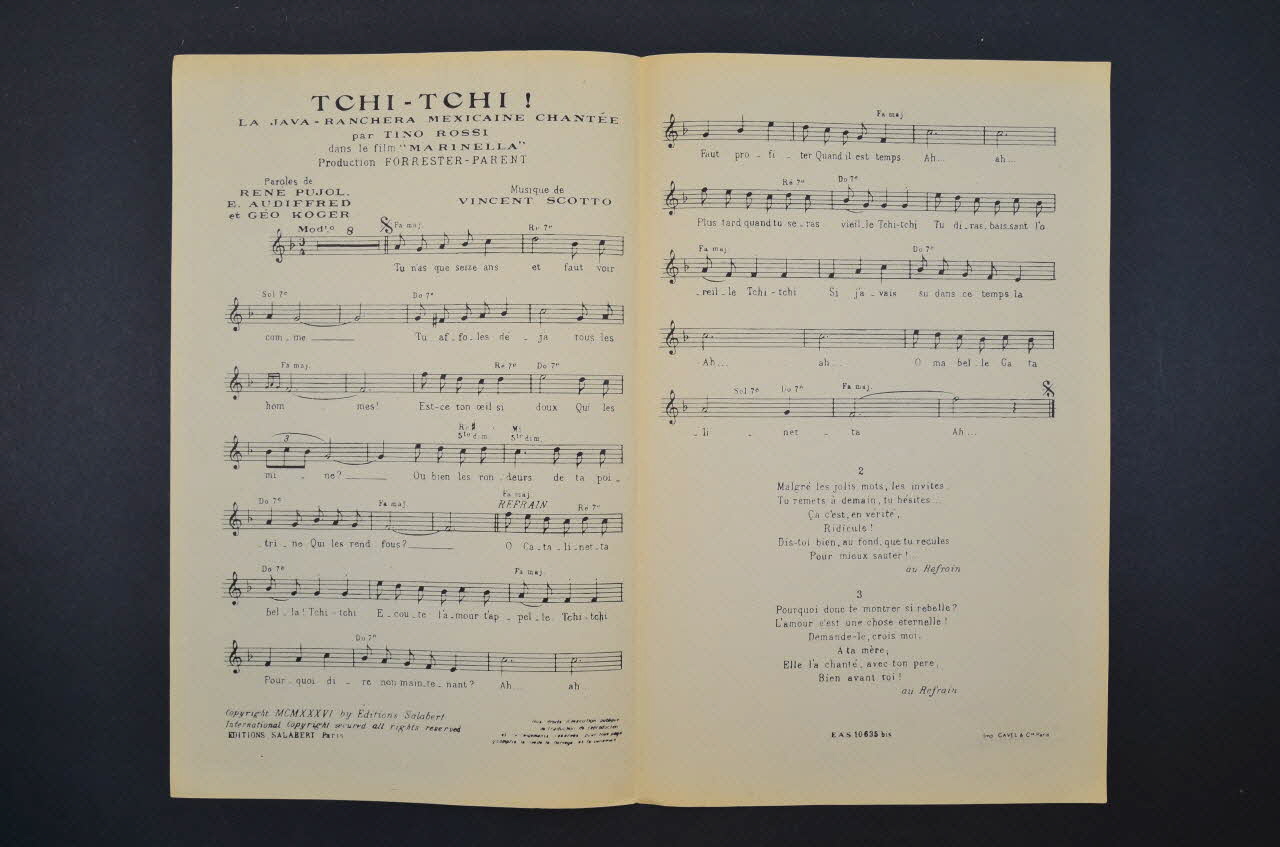 Sur la couverture, le portrait photographique de Tino Rossi et groupe de musiciens en costumes mexicains jouant de la guitare. Les inscriptions renseignent le titre de la chanson et du film, le nom des auteurs, de l'artiste et de l'éditeur.