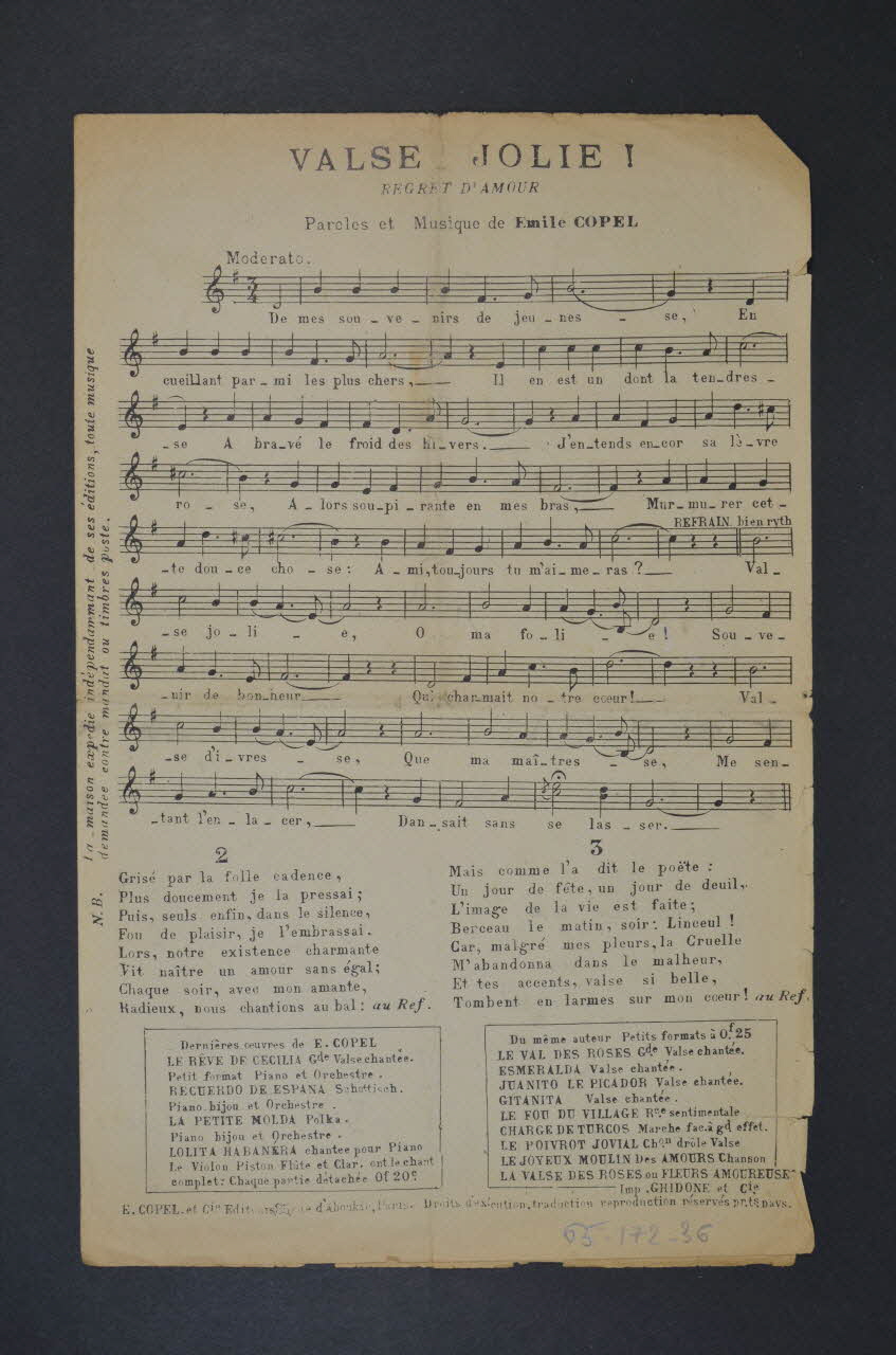 Au recto, le portrait photographique d'Yvonne Garrick, dans un ovale encadré d'une couronne de roses, accompagnant les inscriptions qui renseignent le titre de la chanson, le nom des auteurs, des artistes et de l'éditeur ; dans l'angle inférieur gauche, un logo (?) "Au Triangle d'Amour" avec putti jouant du triangle. Au verso, partition et paroles de la chanson et encart publicitaire.Décor