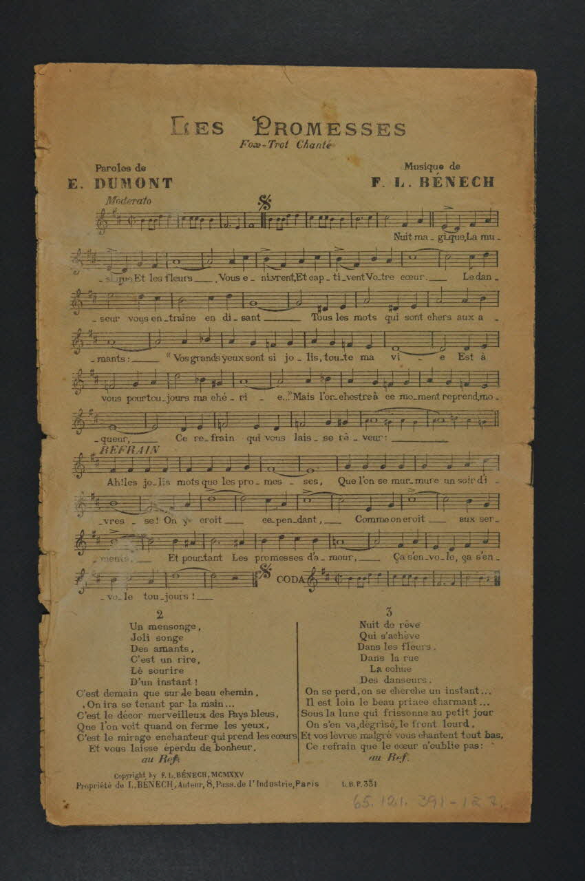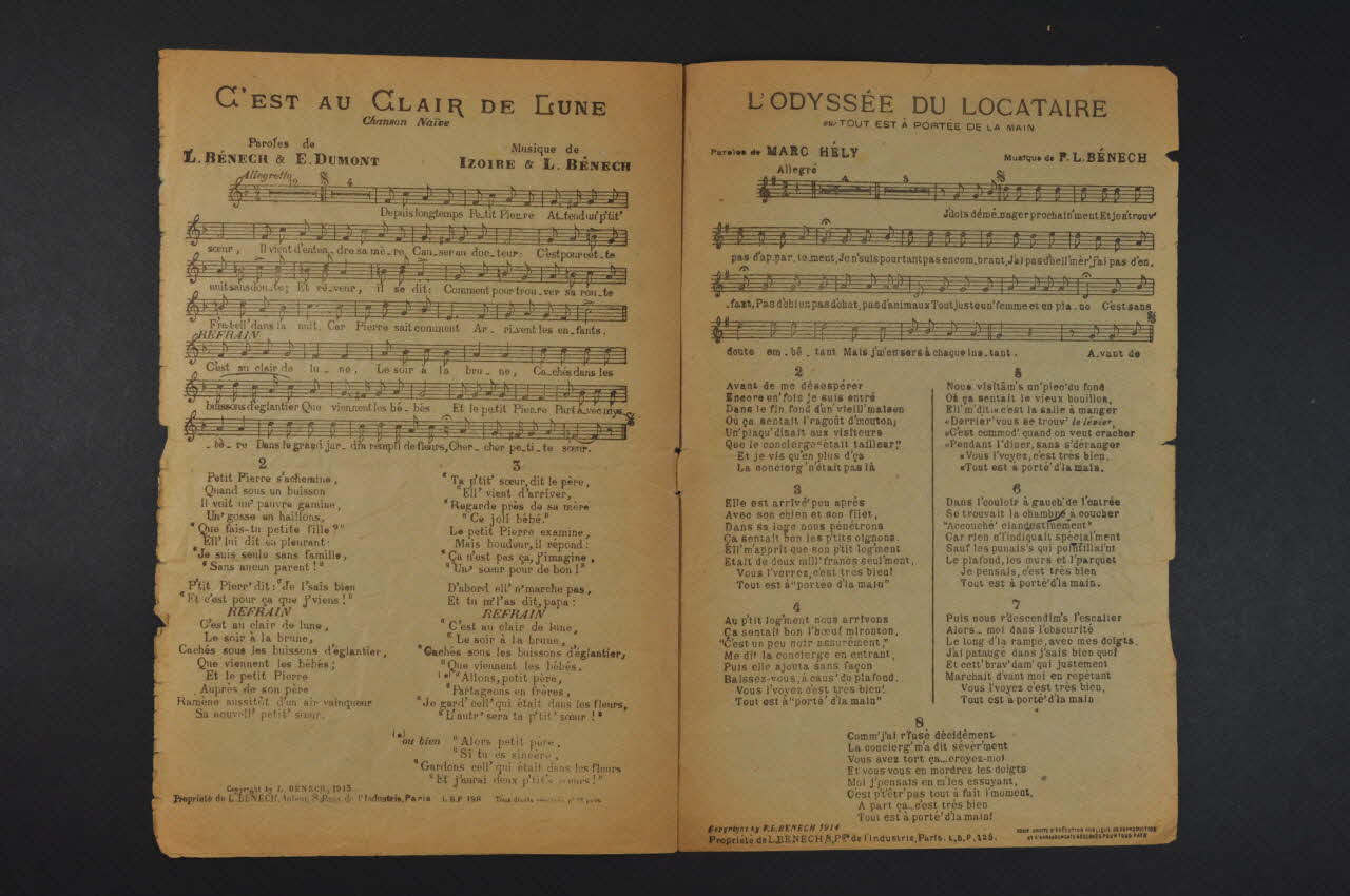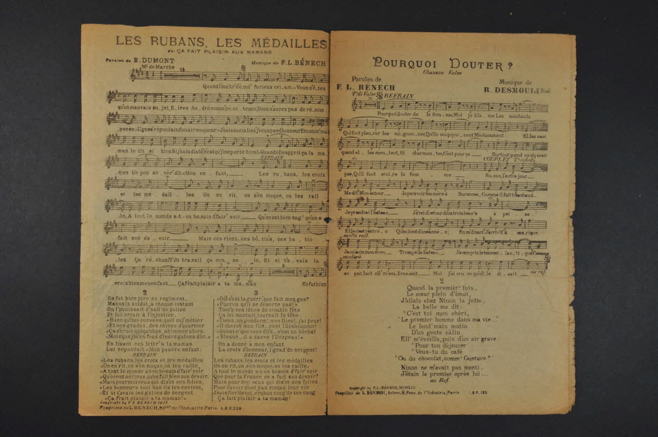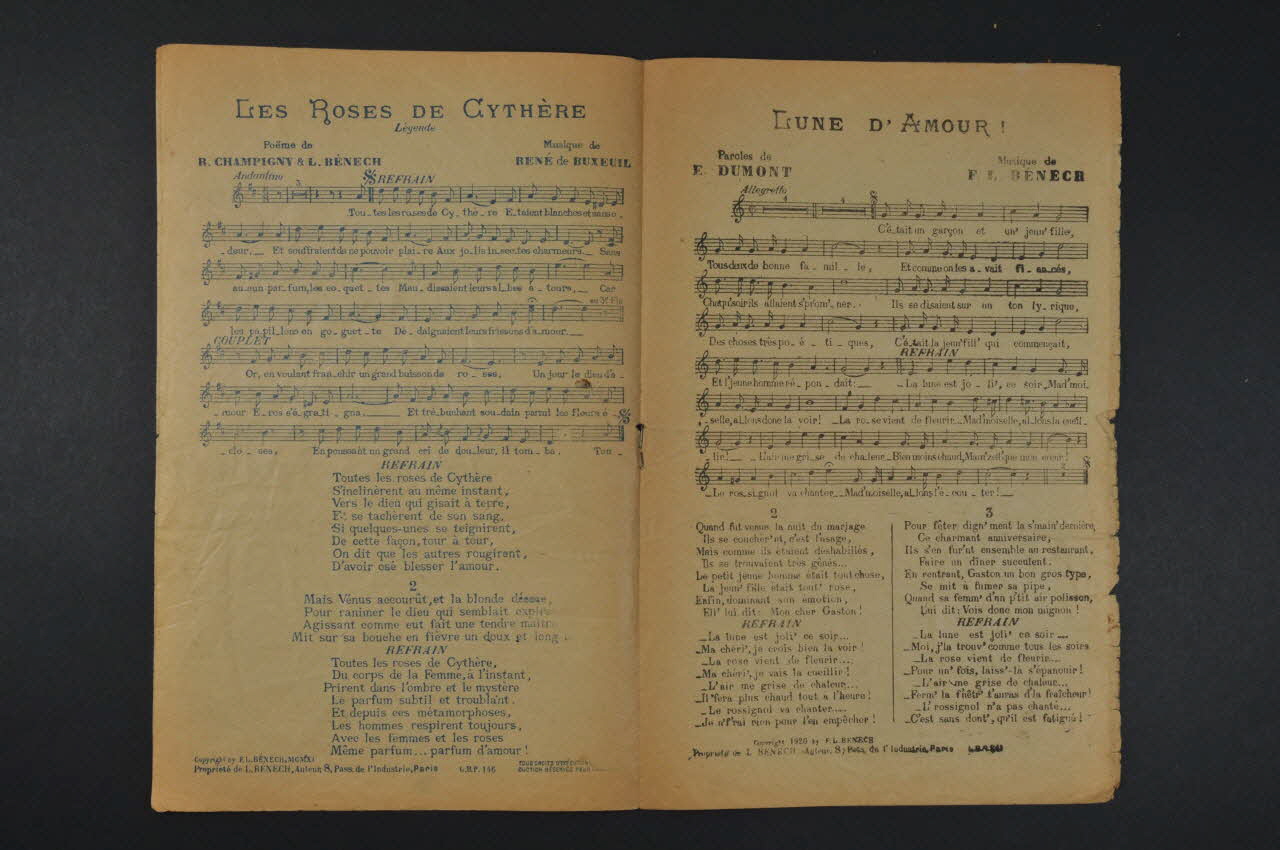 Les inscriptions renseignent les titres des chansons, le nom des auteurs, de l'artiste et de l'éditeur. A l'intérieur et au dos, partition et paroles des chansons.Décor