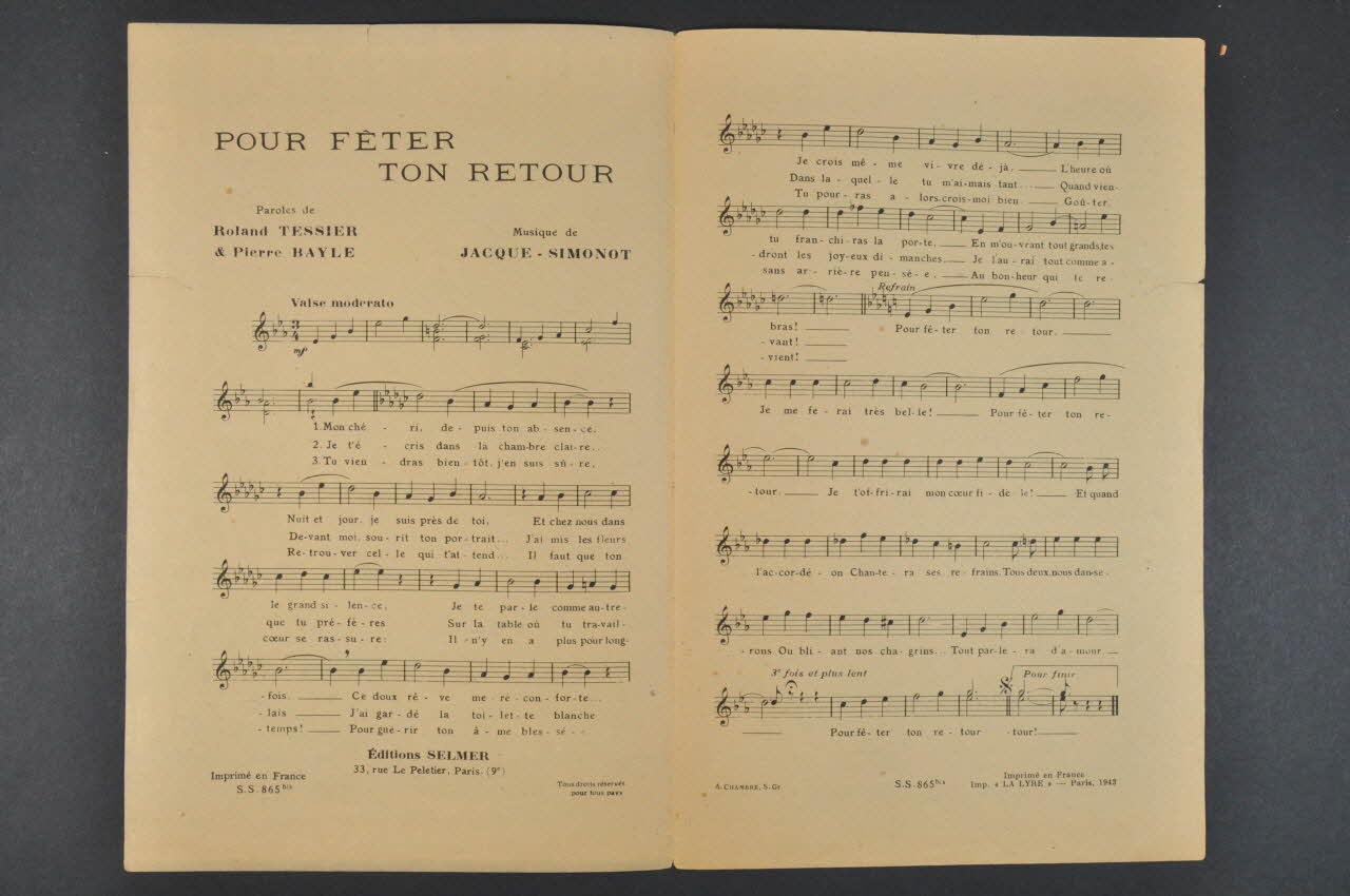 Les inscriptions renseignent le titre de la chanson, le nom des auteurs, de l'artiste et de l'éditeur. A l'intérieur, partitions et paroles de la chanson. Au dos, liste d?autres partitions publiées par l?éditeur.Matériaux et techniques