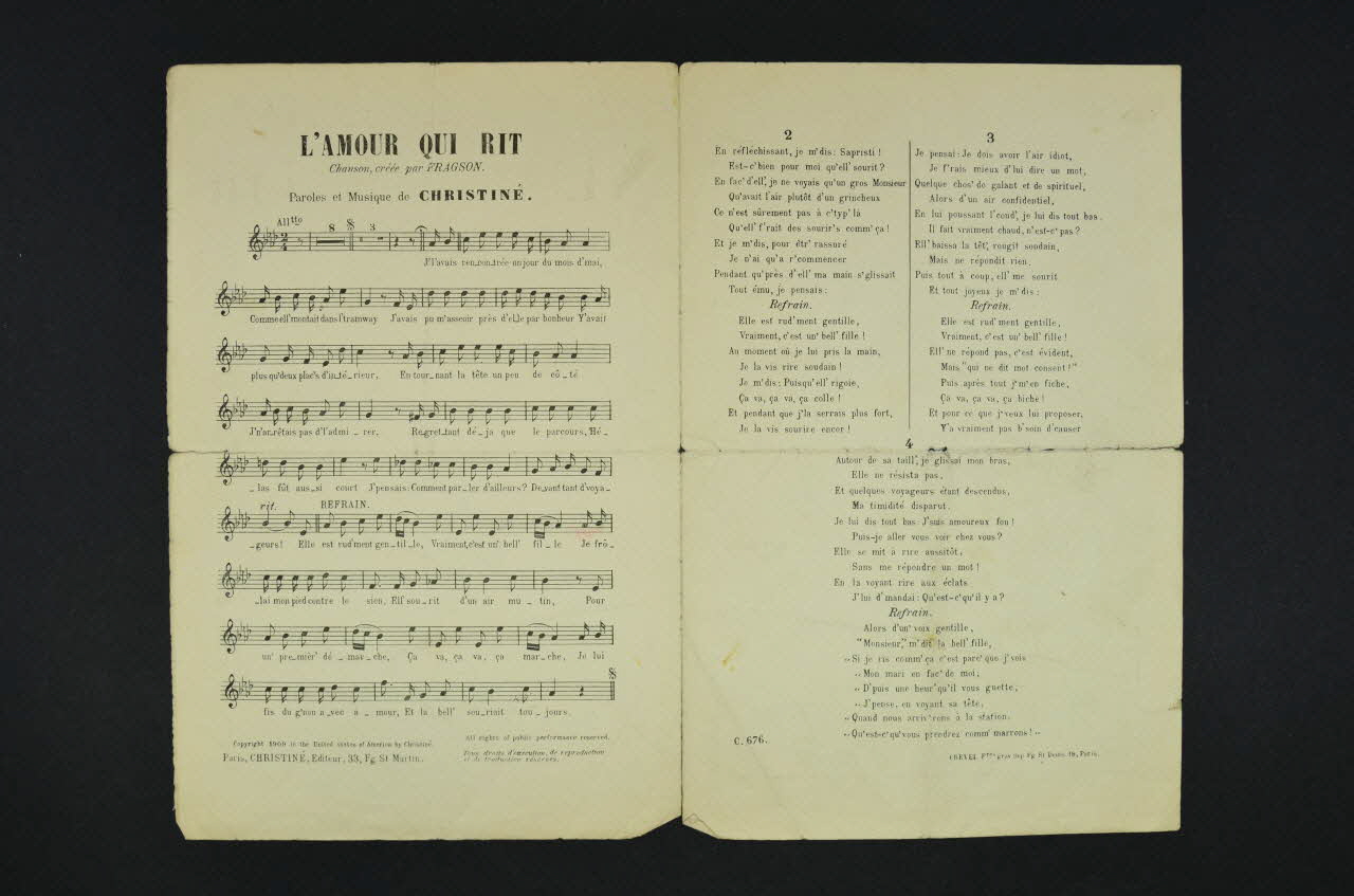 papier imprimé / Feuillet rectangulaire en papier industriel imprimé à l'encre rose (sauf à l'intérieur, encre noire). Sur la couverture, un portrait photographique de Fragson entouré d'une bordure fleurie.