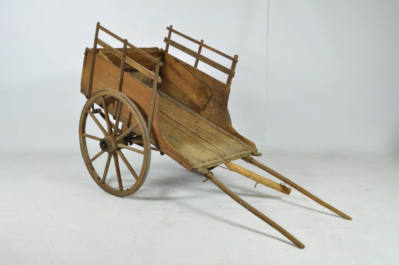 Charrette à chien en bois taillé présentant deux roues à dix rayons, cerclées de fer, des côtés latéraux à claire-voie et deux brancards. Deux pieds mobiles, à l'arrière et devant les brancards. A l'arrière, le dos présente une planche mobile maintenue par une barre d'acier. A l'avant, une partie rectangulaire se relève.Matériaux et techniques