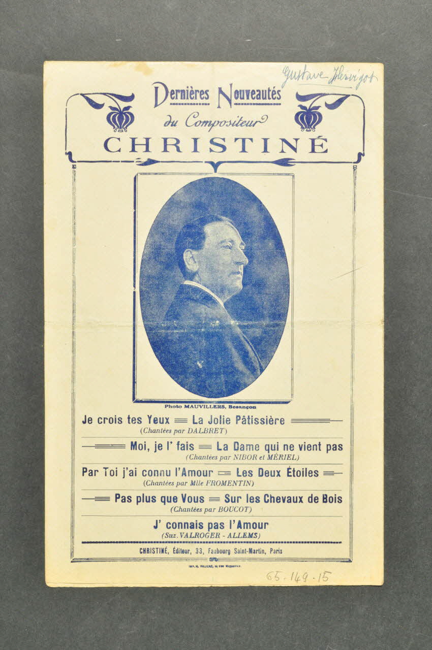 Les inscriptions renseignent le titre de la chanson, le nom des auteurs, de l'artiste et de l'éditeur. A l'intérieur, partitions et paroles de la chanson. Au dos, liste d?autres partitions publiées par l?éditeur.Décor