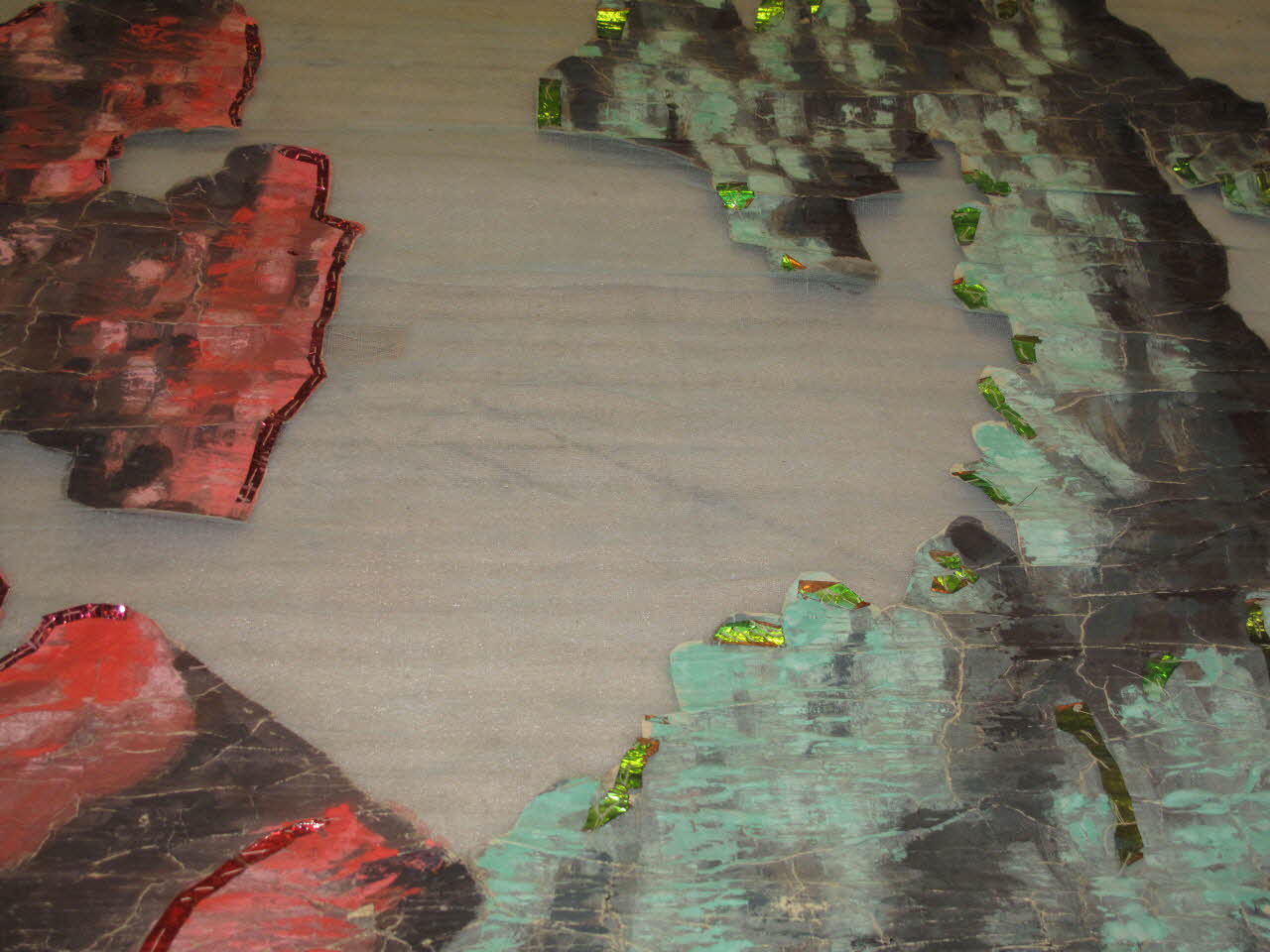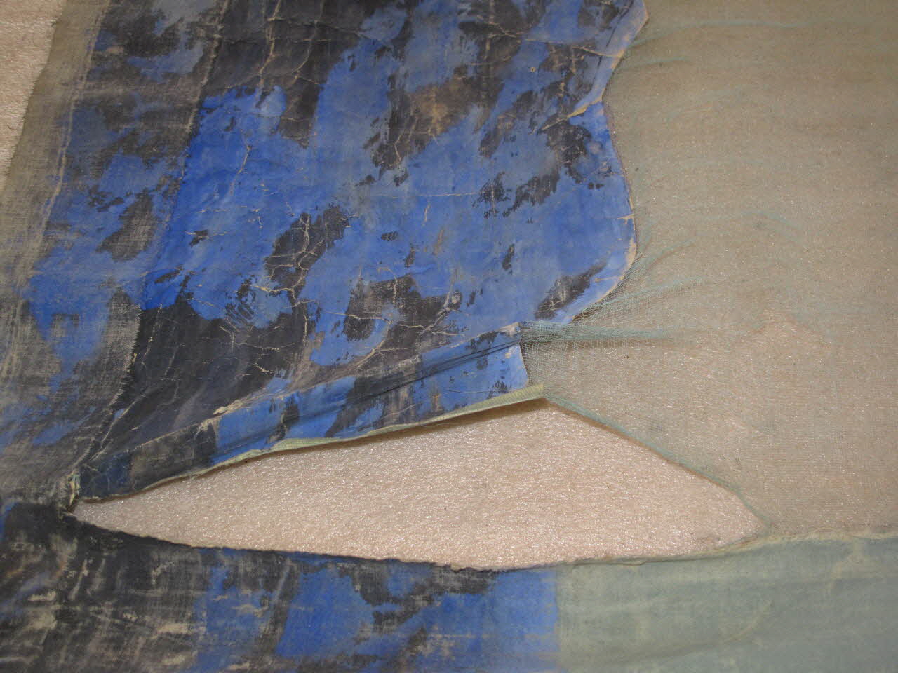 toile peinte à la colle, fixée aux extrémités entre deux baguettes de suspension en bois clouées entre elles ; papier doré rouge et bleu ; gaze de couleur verte / à décor ajouré : le fond de la mer - couleur bleue pour : " le pied de mouton"Décor