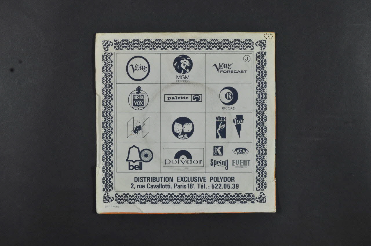Le recto est sur fond orange et porte des inscriptions en bleu. Le verso est sur fond blanc et est illustré de carrés avec des logos commerciaux. La pochette contient un disque vinyle (.1) avec une étiquette rouge portant des inscriptions en noir des deux côtés.Matériaux et techniques