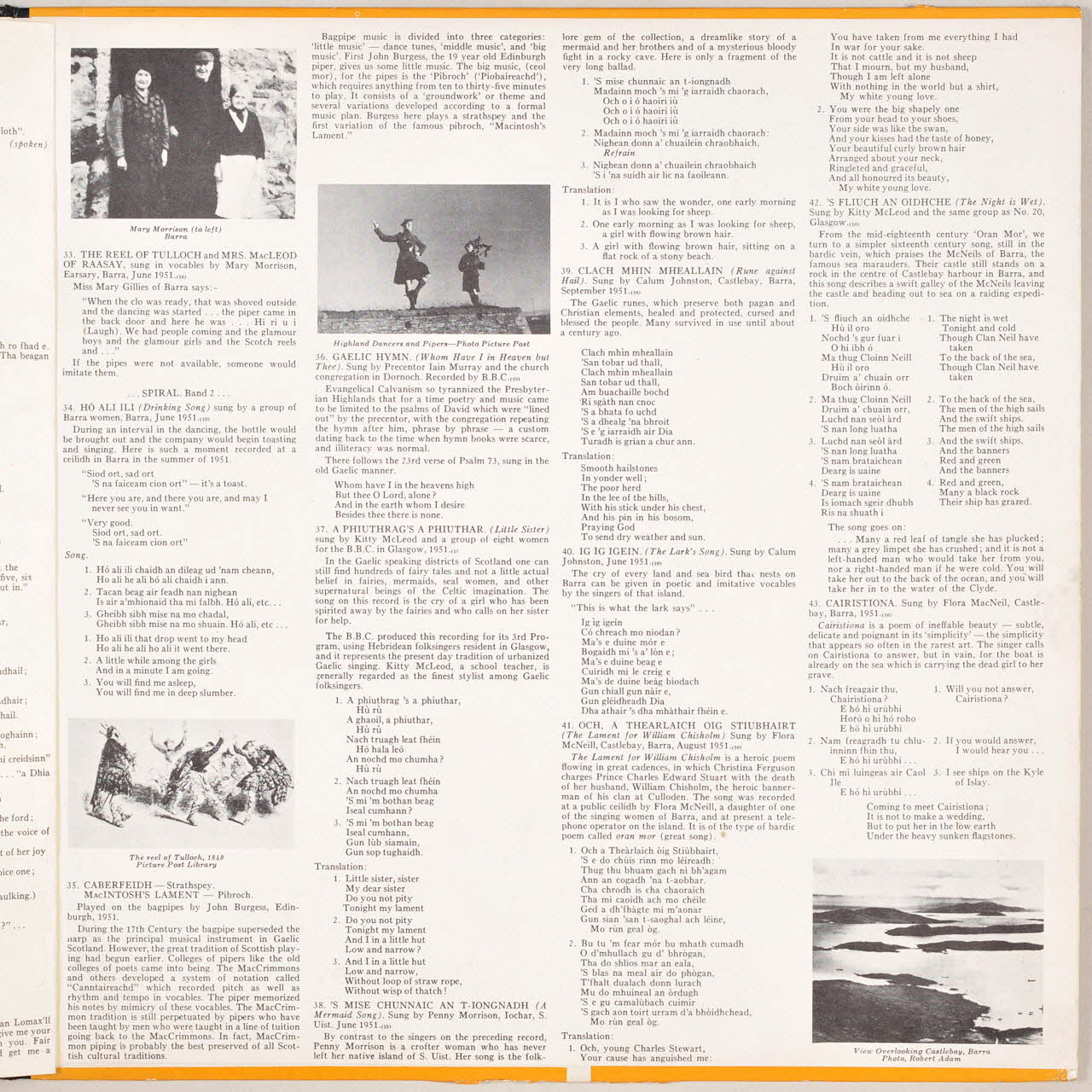 disque 33 tours, Thug mi gaol dhuit (Spinning Song), Fuirch an diugh, Sleepytoon, The dowie dens of Yarrow, Larach do Thacaidean, Portnockie girl, Glasgow Police Band, Tail toddle, Thig a chuinneag thig (Come, butter, come), Glenlogie, 'S mise chunnaic an T-iongnadh (A mermaid song), Dili o idilum, Gu braighe loch iall (The Braes of Lochiel), Thoir a nall Ailean, Ho ail ili, Come all ye Tramps and hawkers, The Hen's March to the Midden, Cairistiona, Tha mullad, tha mulad (There is sorrow), I Paula tee Paule teska, Iomairibh eutrom ho ro (Row lightly), Ho na filibhig chunncas bata, Now the war is over, 'S Fliuch an oidhche (The night is wet), MacPherson's Lament, Gaelic Hymn, Ig, ig, igein (The Lark's song), The tinkler's waddin, Bressay Lullabye, Till ab crodh Laochan (Turn the cows, laddie), My love is like a red red rose, Mrs Mc Leod of Raasay, Eho hao ri o, The chevalier's muster roll, I am a little orphan girl, Caberfeidh (MacIntosh's Lament), The wind blows high, The bonnie lass of Fyvie, Och, a thearlakh oig stiushairt (The lament for Wm. Chisholm), O can ye sew cushions, The Reel of Tulloch, The Souters of Selkirk, Héman dubh hi ri oro, Fail il eileadh, Clach mhin mheallain (Rune Against Hail), A phiuthrag's a phiuthar (Little Sister), The laitd of Drumblair and the de'il among the tailors, Roy's wife of Aldivalloch