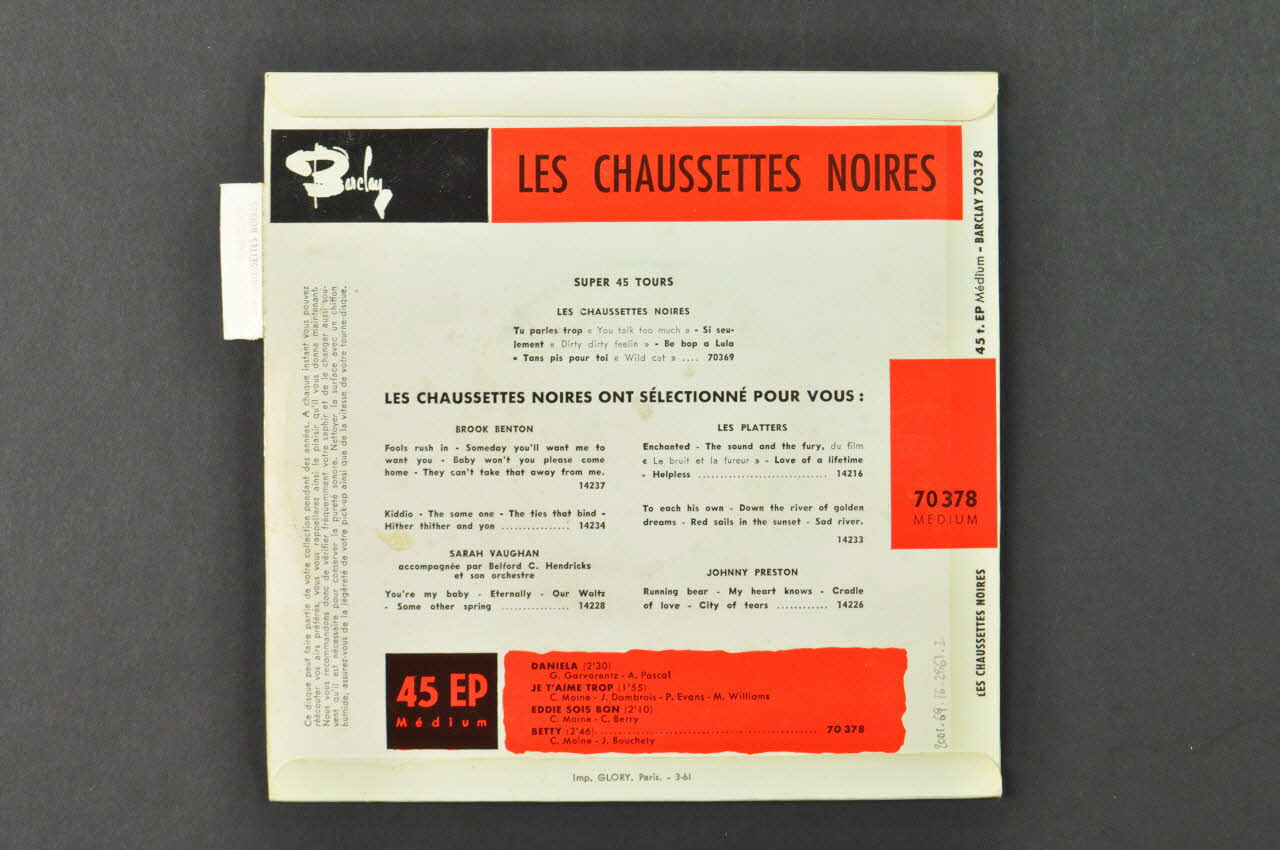 Le disque rond et noir comporte une perforation circulaire au centre. Une étiquette jaune et orange contenant le nom du chanteur, le titre des chansons, le logo de l'éditeur ainsi que d'autres inscriptions en noir est collée au centre.