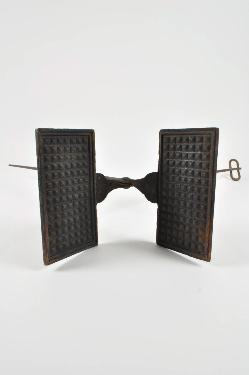 Fer forgé et estampé / Deux branches placées en x terminées par deux plaques rectangulaires comportant un quadrillage de pyramides tronquées ; les queues des branches se terminent par des boucles fermées sur un anneau allonge pour maintenir le gaufrier fermé.Matériaux et techniques