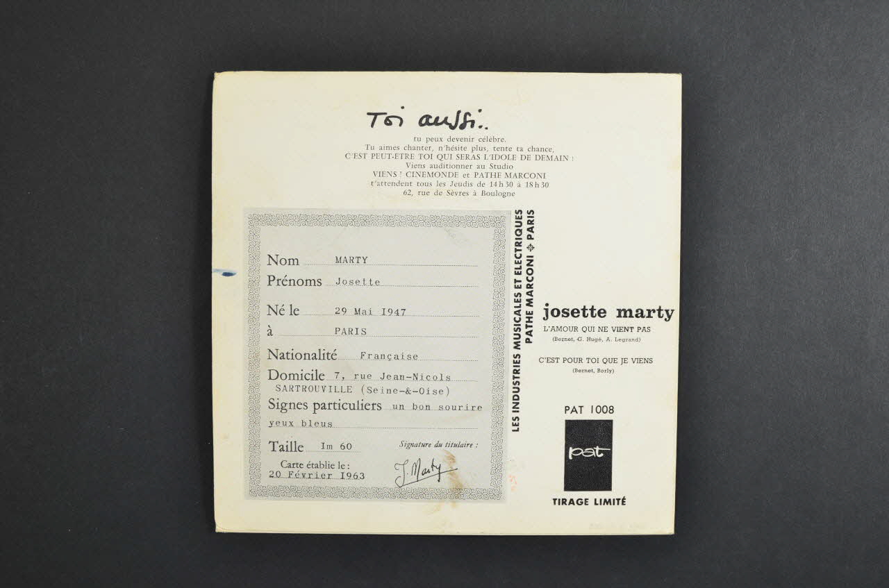 Le recto comporte une photographie noir et blanc de la chanteuse apparaissant au bout d'une spirale orange sur fond blanc. Le nom de l'artiste et les titres des chansons sont inscrits dans la partie supérieure. Le logo de l'éditeur est dans l'angle supérieur droit. Le verso contient les titres des chansons, le logo de l'éditeur sur fond blanc, ainsi qu'une fiche d'identité de la chanteuse dans un encart gris.Matériaux et techniques