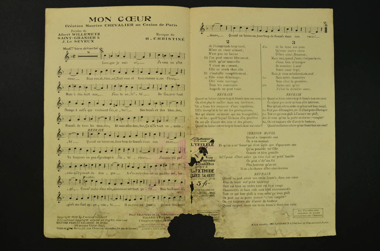 Feuillet rectangulaire en papier industriel imprimé à l'encre. L'intérieur comporte les paroles et la partition de la chanson. Au dos, publicité pour l'éditeur